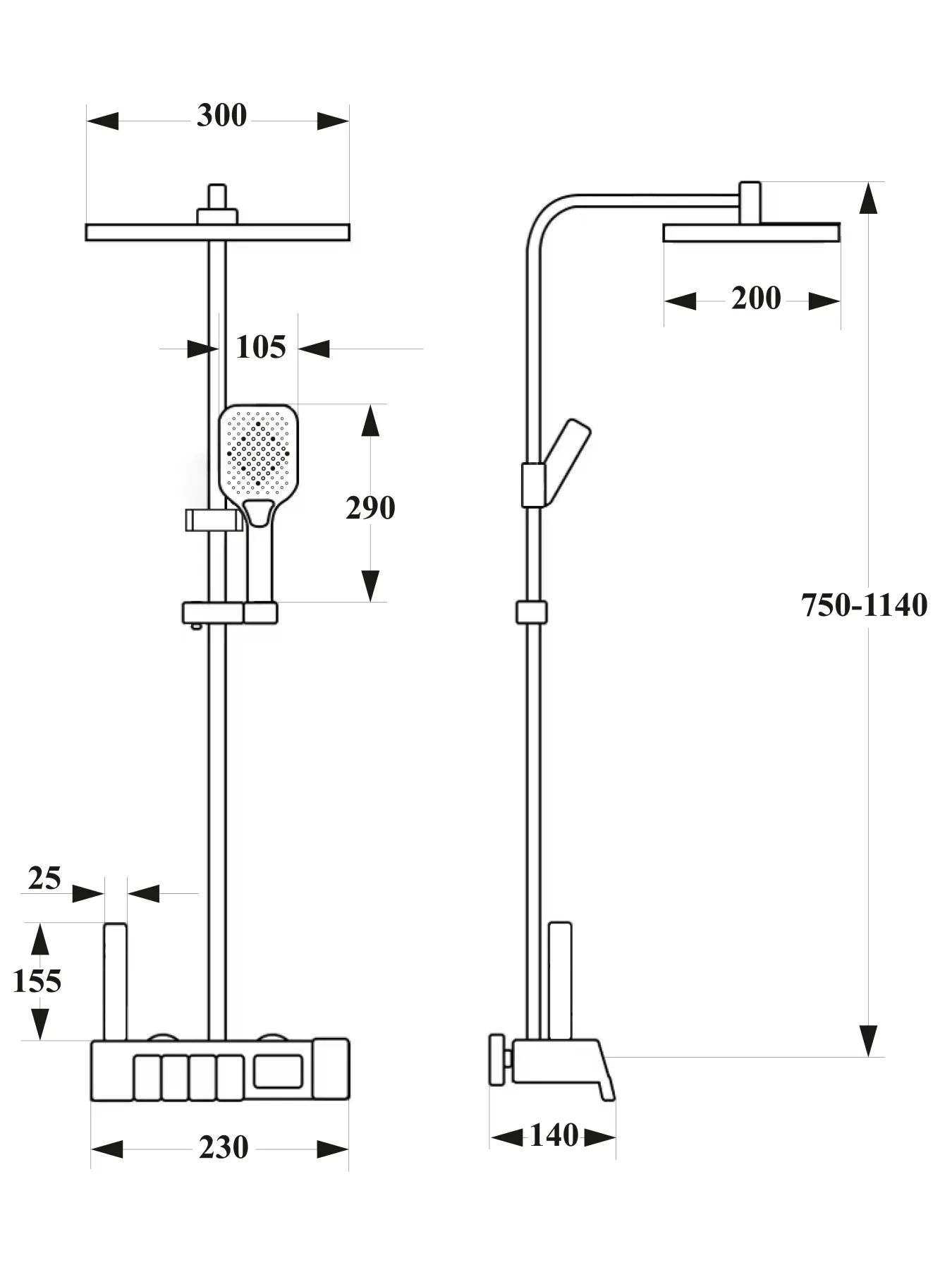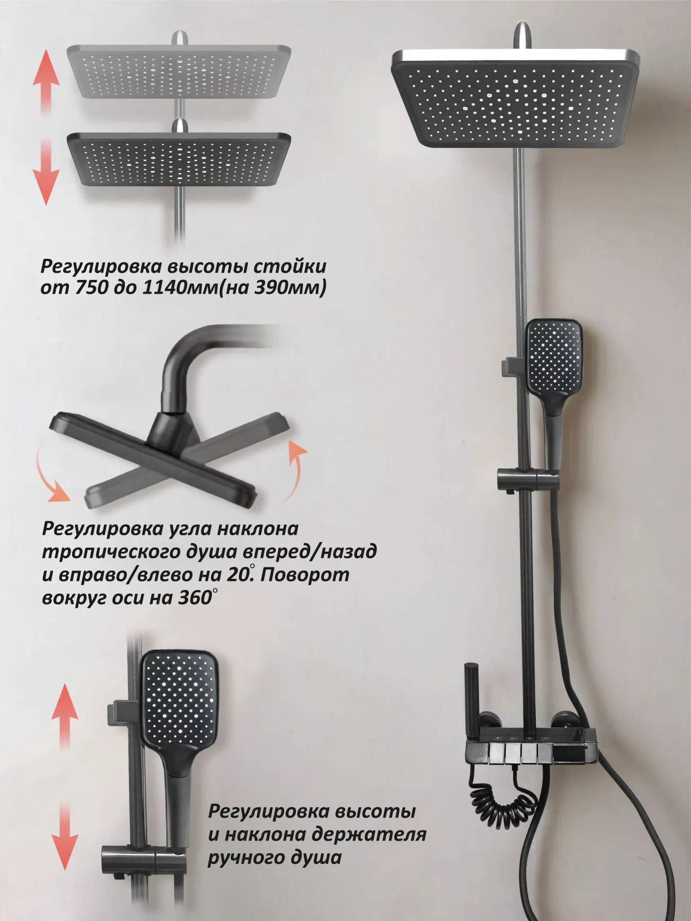 - головной (тропический) душ – выполнен из ABS- пластика, оснащен силиконовыми форсунками для самоочистки системы от налета. Душ имеет увеличенный размер – целых 30см в длину и 20см в глубину. Возможна не только регулировка излива по высоте штангой держателя, но и вращение ее на 90 градусов вправо/влево. Сам излив крепится к ней шарниром, который позволяет вращать душ и отклонять в пределах 20-30 градусов.
