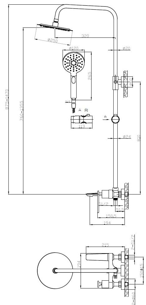 Оснащение: смеситель для душа, верхний душ нерж.сталь диаметр 25 см, ручной душ АБС-пластик трёхпозиционный, душевой шланг нержавеющая сталь
