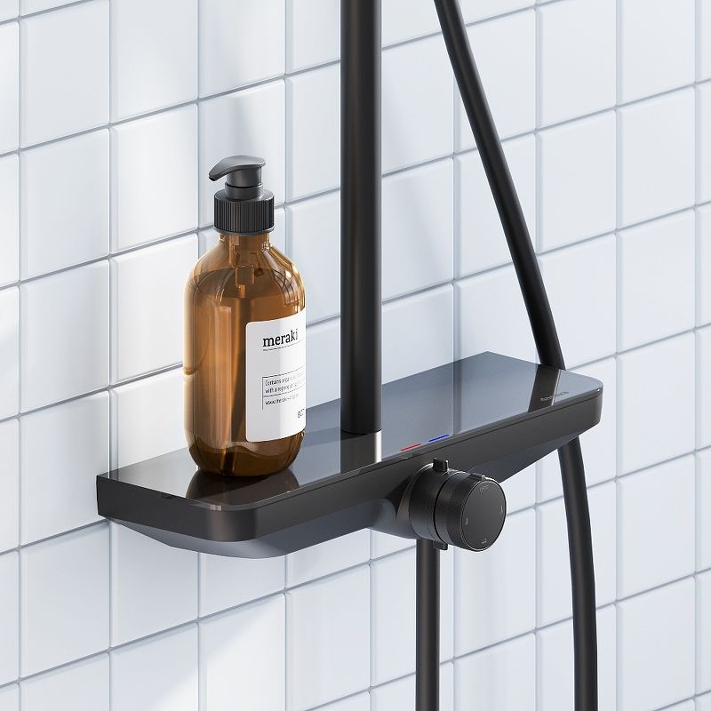 Душевая стойка Damixa Merkur 940730300 Черная матоваяЧистые геометричные линии душевой системы Merkur в сочетании с черным матовым покрытием идеально впишутся в интерьер современной ванной комнаты в скандинавском стиле. Несмотря на минималистичный дизайн, душевые системы этой серии отличаются широким функционалом и необычайной эргономичностью. Продуманные детали: корпус смесителя выполнен в виде удобной полочки из закаленного стекла, на которой можно разместить необходимые под рукой вещи. Невидимый излив совмещает в себе эстетику и удобство. Простое и интуитивное управление: регулируйте температуру воды и переключайте потоки между изливом, ручной и верхней лейкой плавным поворотом двухуровневой ручки. Настоящее SPA прямо у вас дома: увеличенный размер тропической лейки с регулируемым углом наклона (220 мм) и 3 режима ручного душа сделают ваши ежедневные ритуалы незабываемыми. Благодаря телескопической штанге с диапазоном регулировки в 400 мм водные процедуры будут одинаково комфортны абсолютно для всех членов семьи. Специальное PVD-покрытие гарантирует чрезвычайную прочность душевой системы. Матово-черная поверхность не выцветает с годами и устойчива к механическим повреждениям, загрязнениям и отпечаткам пальцев.
