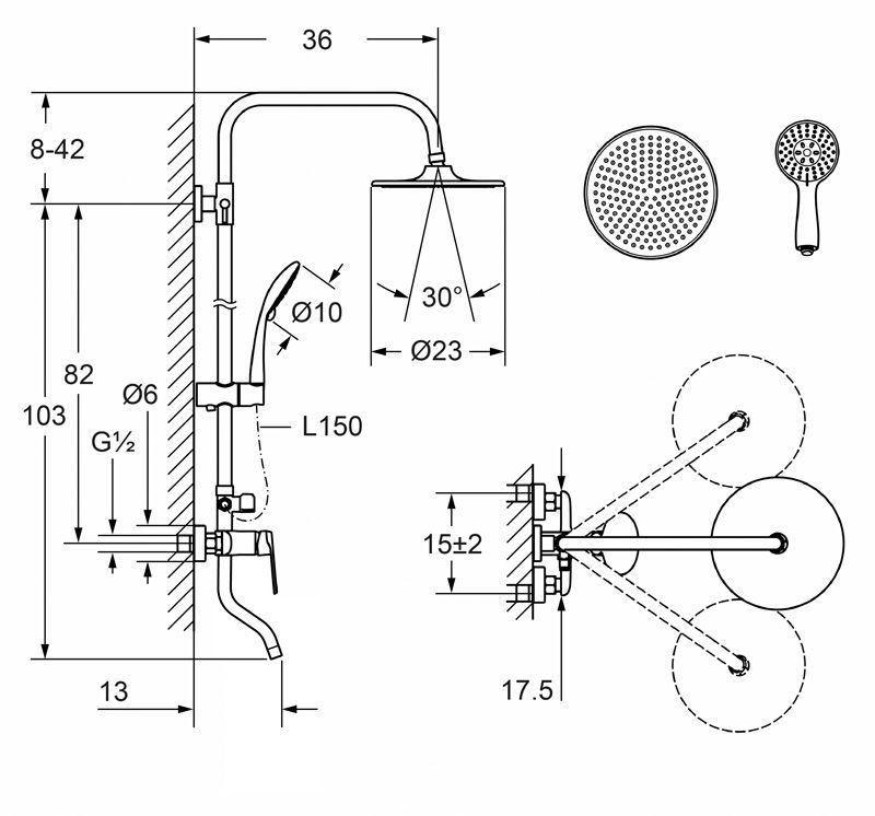 верхний душ, ручной душ, душевой шланг, s-образные эксцентрики, набор прокладок.