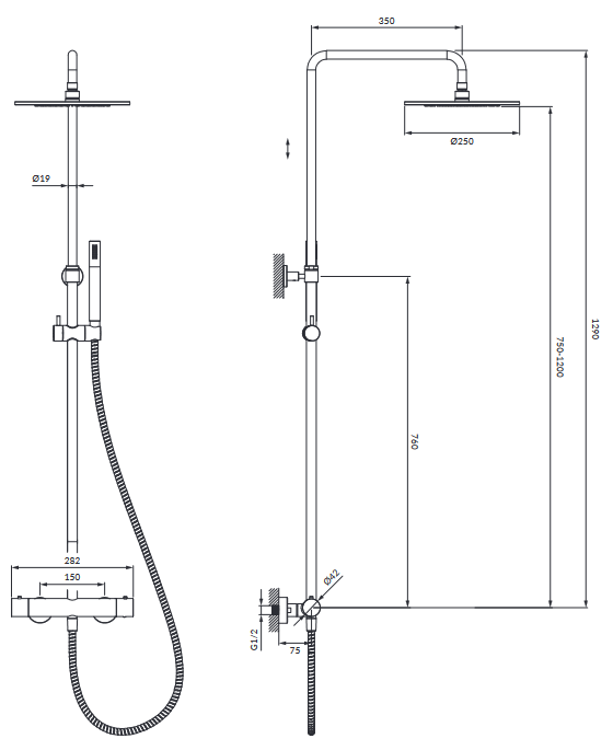 - верхний душ латунный, размер: ø25 см, отдаленность от стены: 35 см