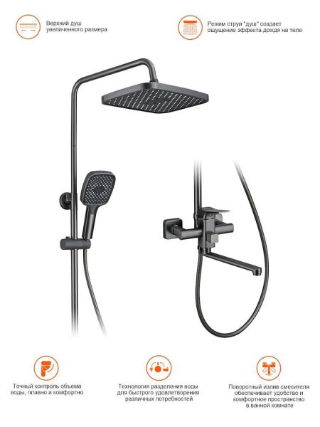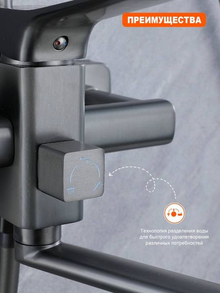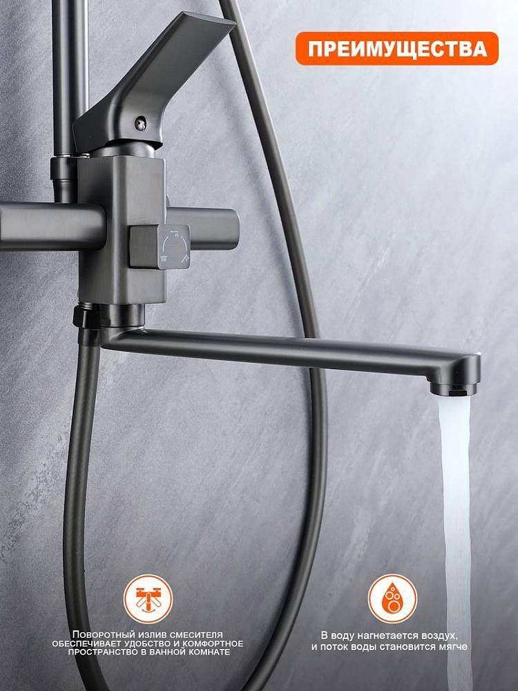 Система оснащена поворотным изливом, который идеально подходит для удобного наполнения ванны и позволяет использовать душ в качестве смесителя для других нужд.