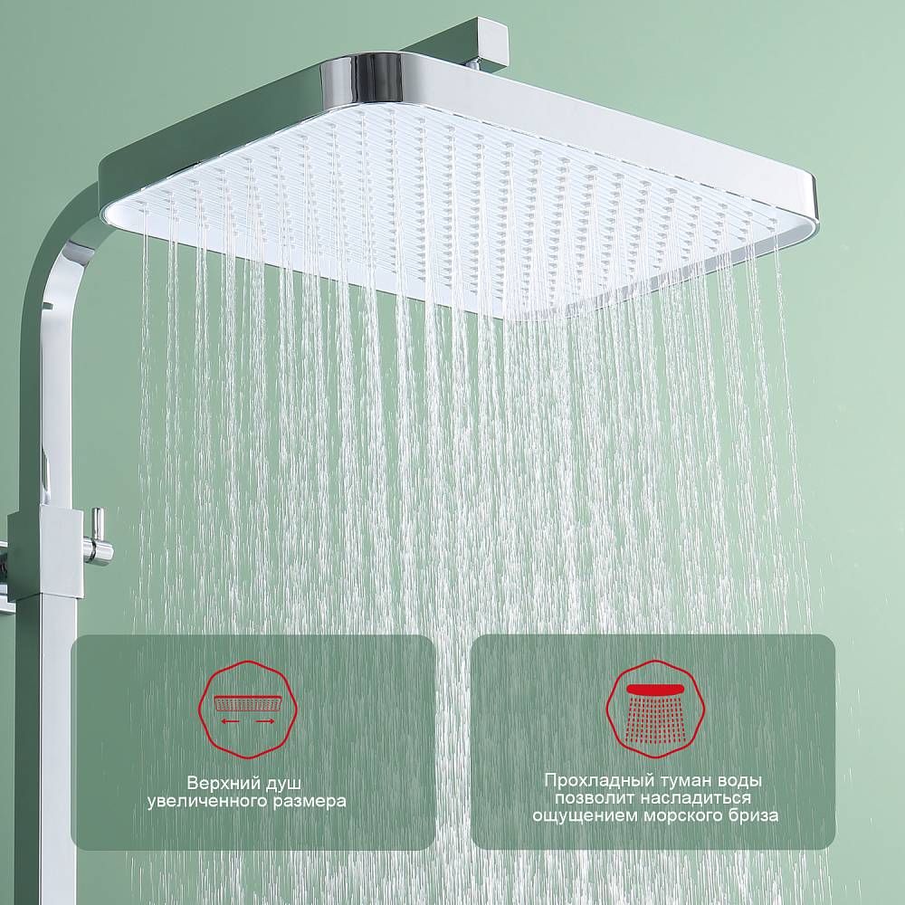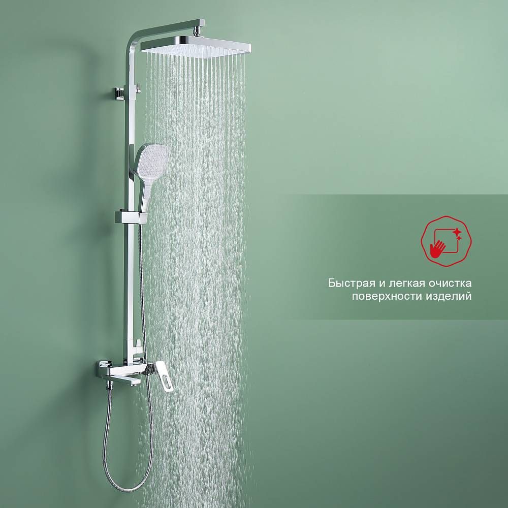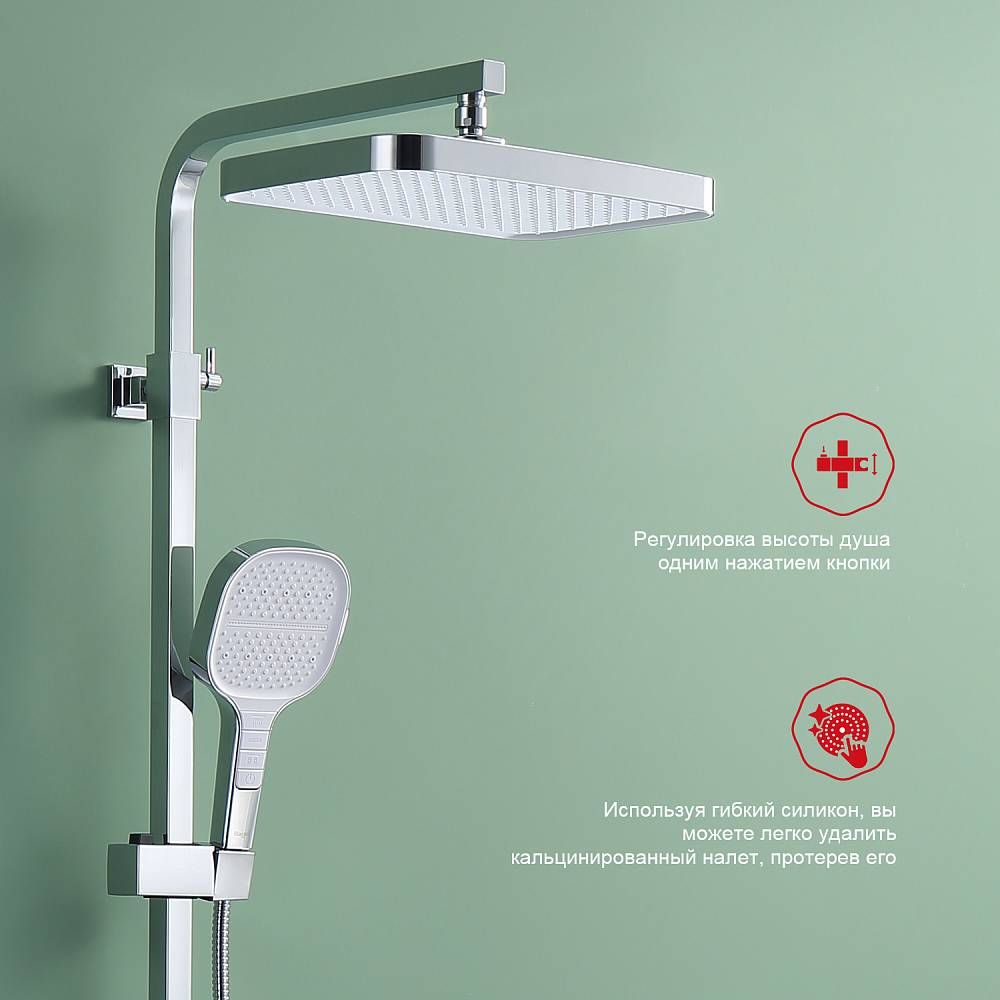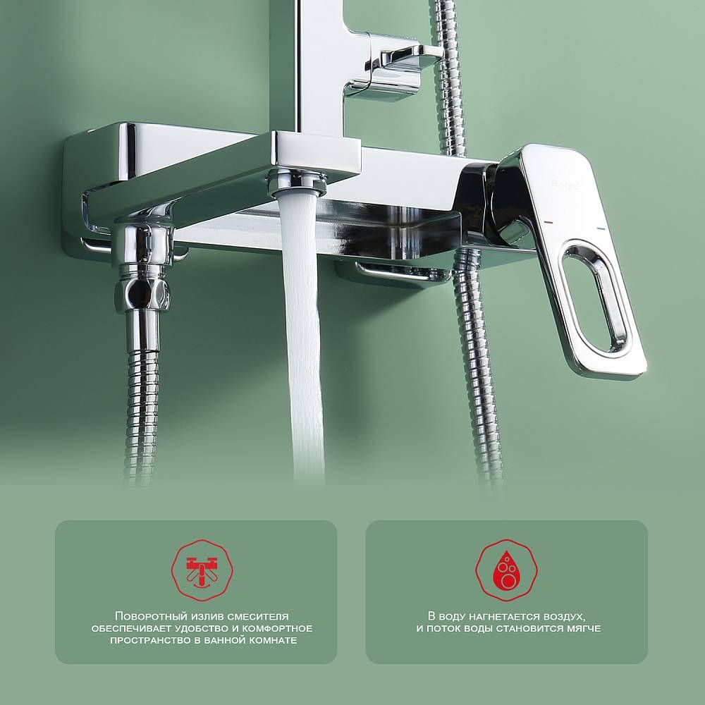 Душевая система Raglo R51.24.Материал: латунь.Управление: однорычажное.Механизм: керамический картридж.Излив: поворотный. Аэратор.Регулируемая по высоте душевая штанга: 1087-1655 мм.Форма верхнего душа: прямоугольная.Размер верхнего душа (ШхД): 330х220 мм.Регулируемый по высоте и наклону держатель ручного душа.Количество режимов струи ручного душа: 4.Отверстия для монтажа: 3.Стандарт подводки: G 1/2.Монтаж: на стену.