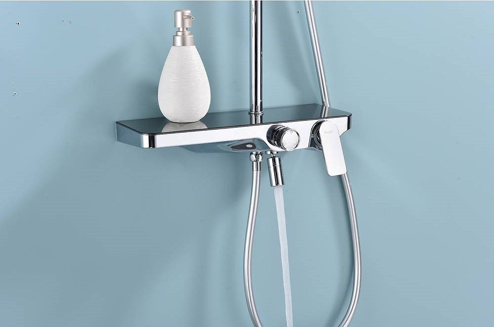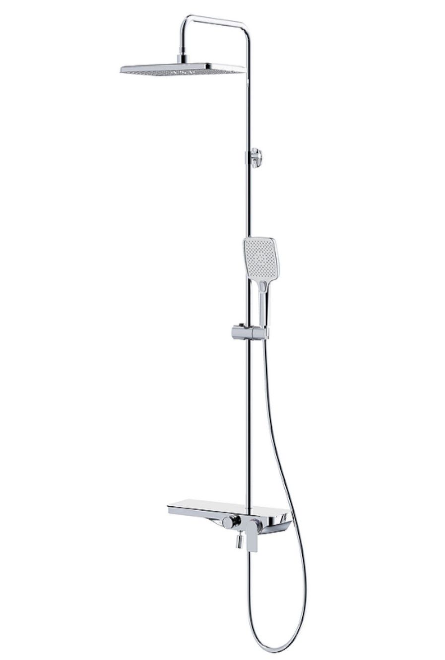 Душевая система Raglo R60.24.Материал: латунь.Управление: однорычажное.Механизм: керамический картридж.Скрытый излив с аэратором.Полка из стекла.Регулируемая по высоте душевая штанга: 1100-1530 мм.Форма верхнего душа: прямоугольная.Размер верхнего душа (ШхД): 300х200 мм.Регулируемый по высоте держатель ручного душа.Количество режимов струи ручного душа: 3.Переключение режимов ручного душа: кнопочное.Отверстия для монтажа: 3.Стандарт подводки: G 1/2.Монтаж: на стену.