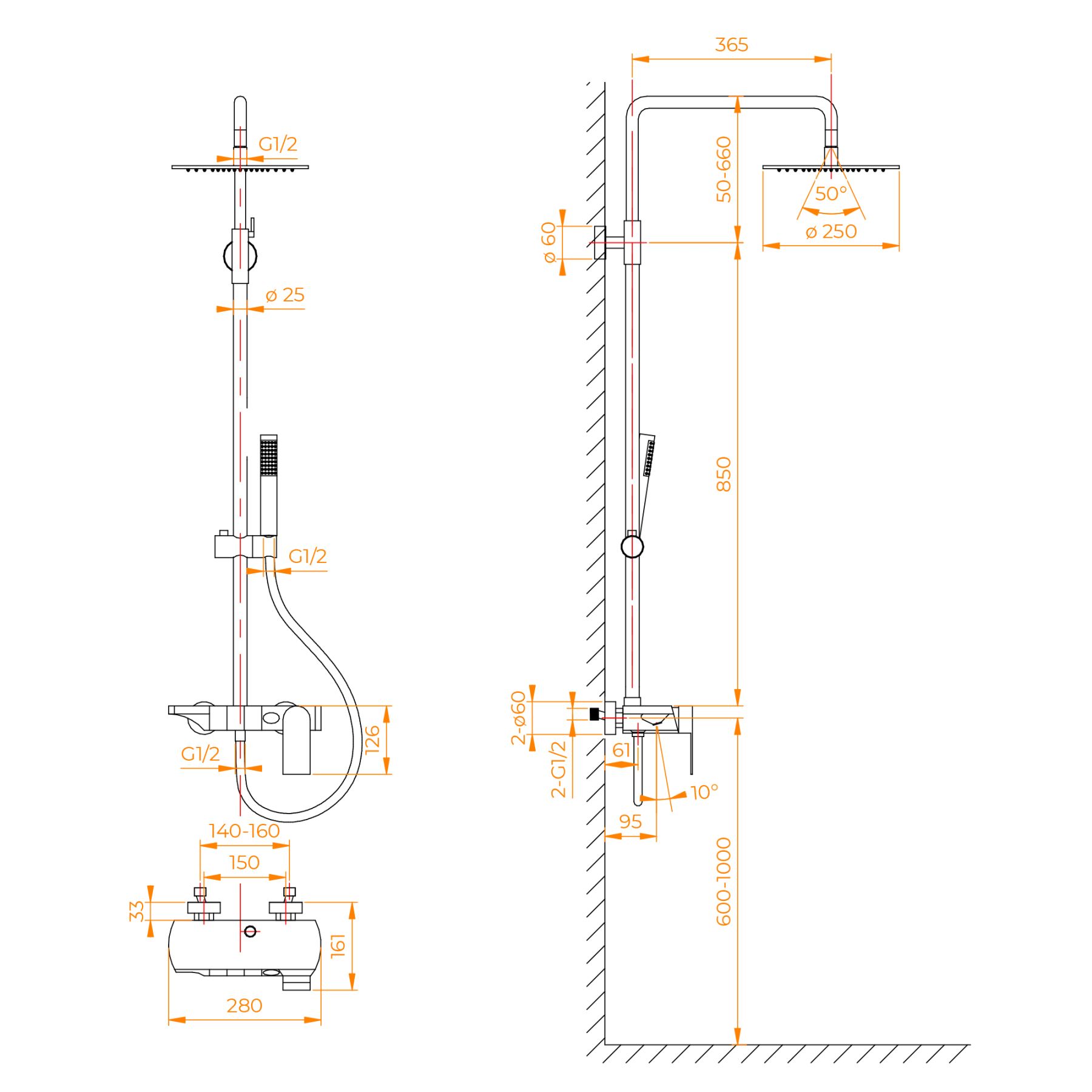 - Стальная штанга с регулировкой высоты головного душа