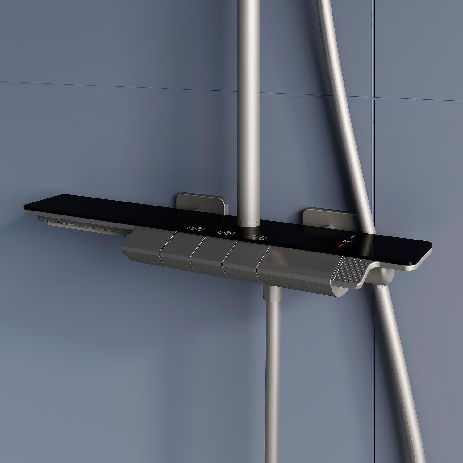 - Вместительная стеклянная полка для душевых принадлежностей;