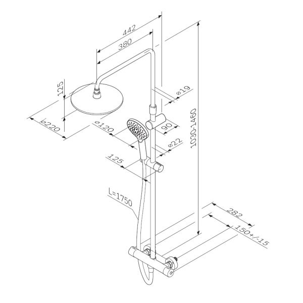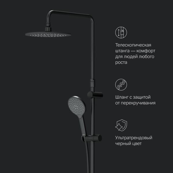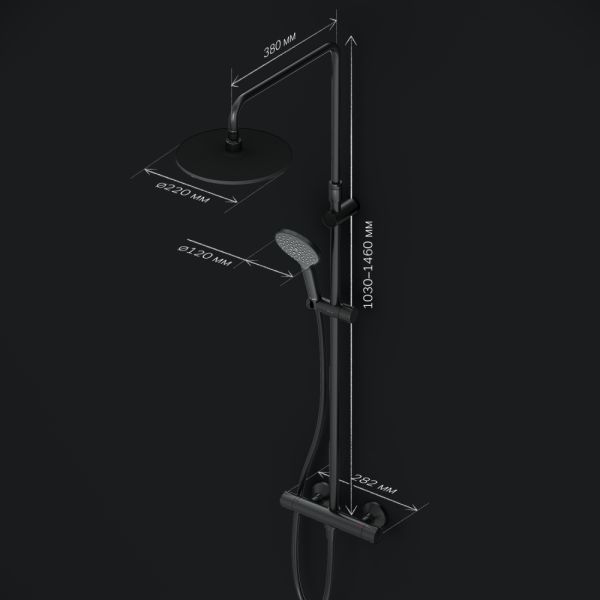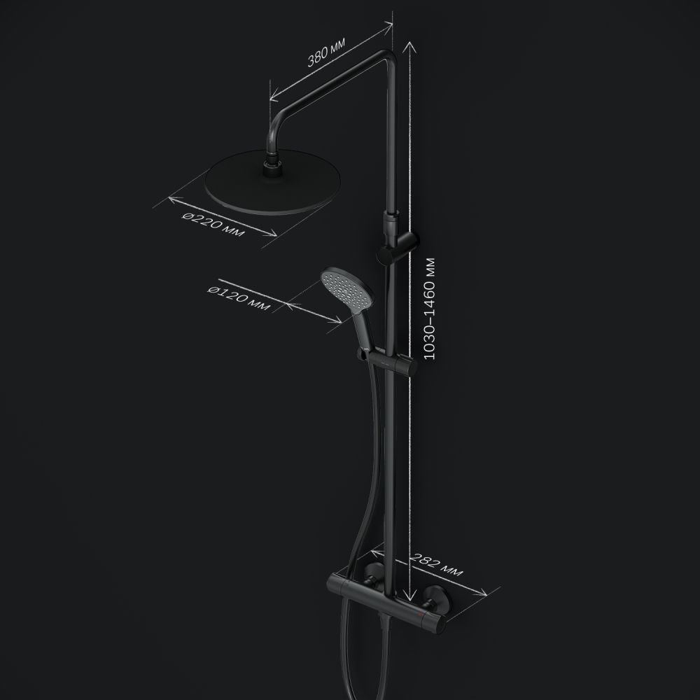 Продуманные детали для удобства использования: штанга регулируется по высоте в диапазоне от 1030 до 1460 мм, обеспечивая комфорт для людей любого роста, шаровый шарнир в держателе верхнего душа позволяет регулировать угол его наклона, душевой шланг 1750 мм, верхний душ диаметром 220 мм, ручной душ диаметром 120 мм.