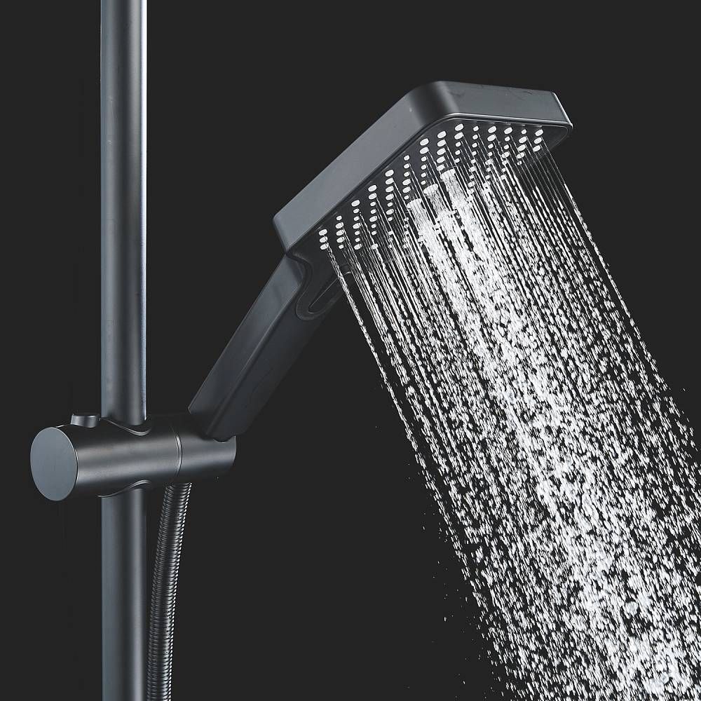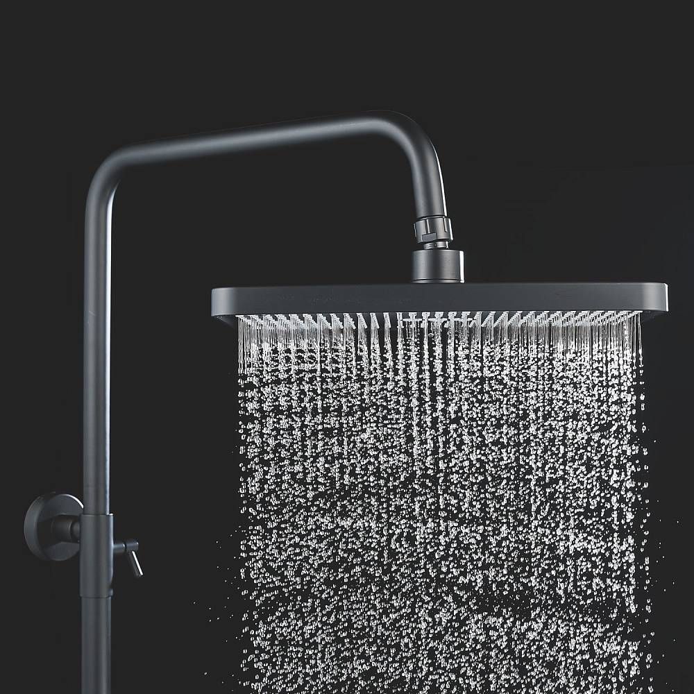 Верхний душ размером 305x205 мм из ABS-пластика регулируется по высоте благодаря телескопической штанге и по наклону с помощью встроенного шарнира, что обеспечивает максимальный комфорт и удобство использования. Самоочищающиеся силиконовые форсунки предотвращают образование известкового налета и сохраняют чистоту и силу потока воды.
