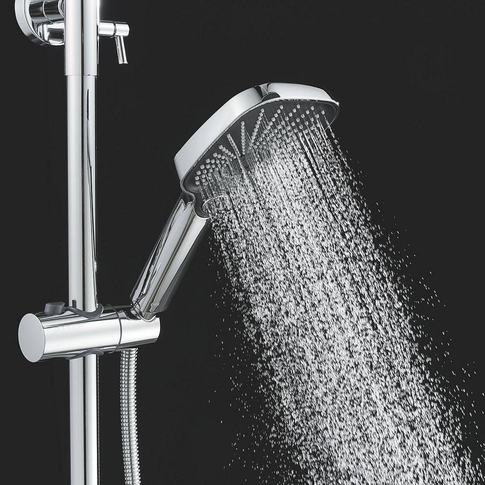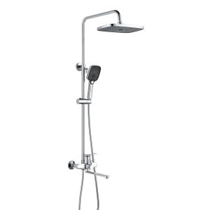 Верхний душ размером 300x190 мм из ABS-пластика регулируется по высоте благодаря телескопической штанге и по наклону с помощью встроенного шарнира, что обеспечивает максимальный комфорт и удобство использования. Самоочищающиеся силиконовые форсунки предотвращают образование известкового налета и сохраняют чистоту и силу потока воды.