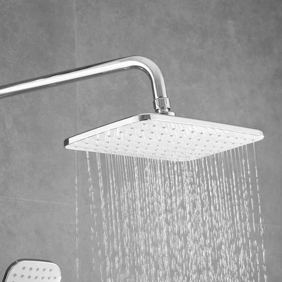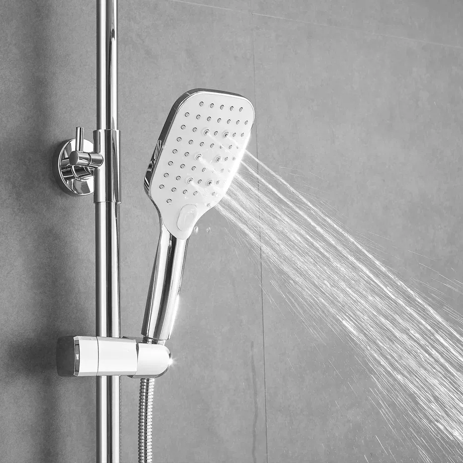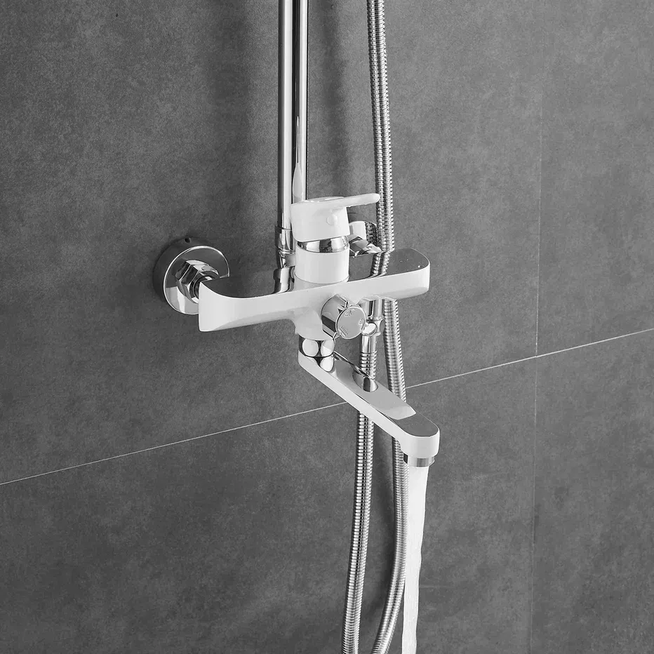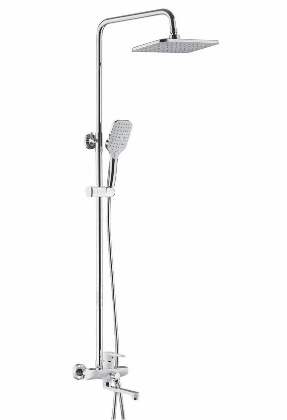 Душевая система Shevanik S8136F, белый/хром.Количество режимов струи: 3.Размер верхнего душа: 29,5x18 см.Управление: рычажное.Излив для наполнения ванны: да.