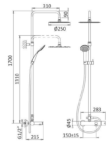 Душевая стойка со смесителем для ванны, верхним и ручным душем, верхний душ из нержавеющей стали, чёрный матовый Cezares CZR-B-CVD-NOP
