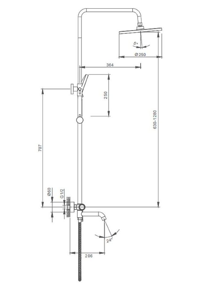 Форма верхнего душа: круглая. Диаметр верхнего душа: 250 мм. Количество режимов струи ручного душа: 3. Регулируемая душевая штанга: 630-1280 мм. Монтаж: на стену.