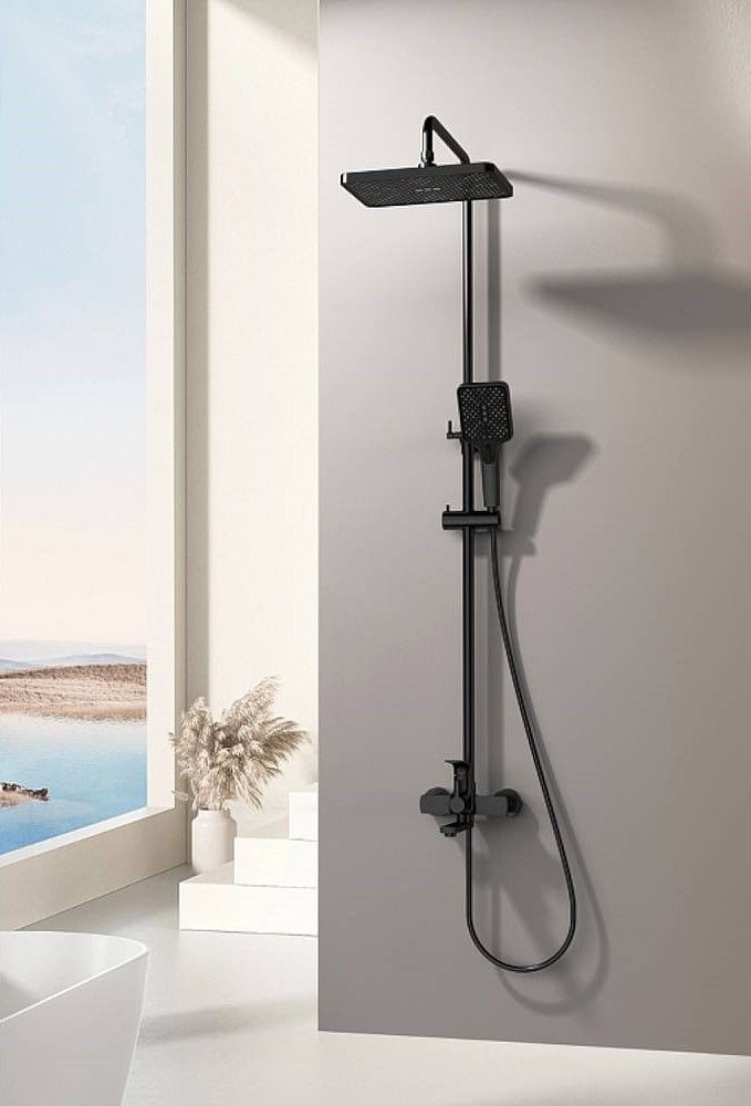 Душевая система Splenka S30.24.06, черный. Душевая система подходит для ванны и душа. Излив у системы имеет функцию переключения режима подачи воды. Верхний душ имеет прямоугольную форму размером 32 на 21 см. Ручная лейка у системы 3-х режимная. Лейки изготовлены из авс-пластика.