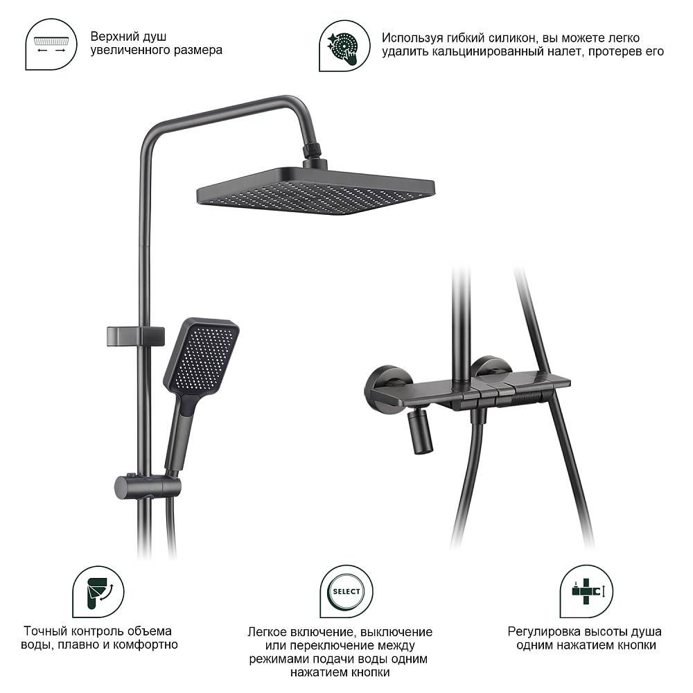 Душевая система Splenka S52.24.09, графит. Душевая система Splenka изготовлена из качественной латуни. Смеситель оснащен аэратором который гарантирует ровный и мягкий поток воды. Душевой комплект упакован в фирменную коробку. Верхний душ - 320*210мм. Душевая лейка - 3 режима.