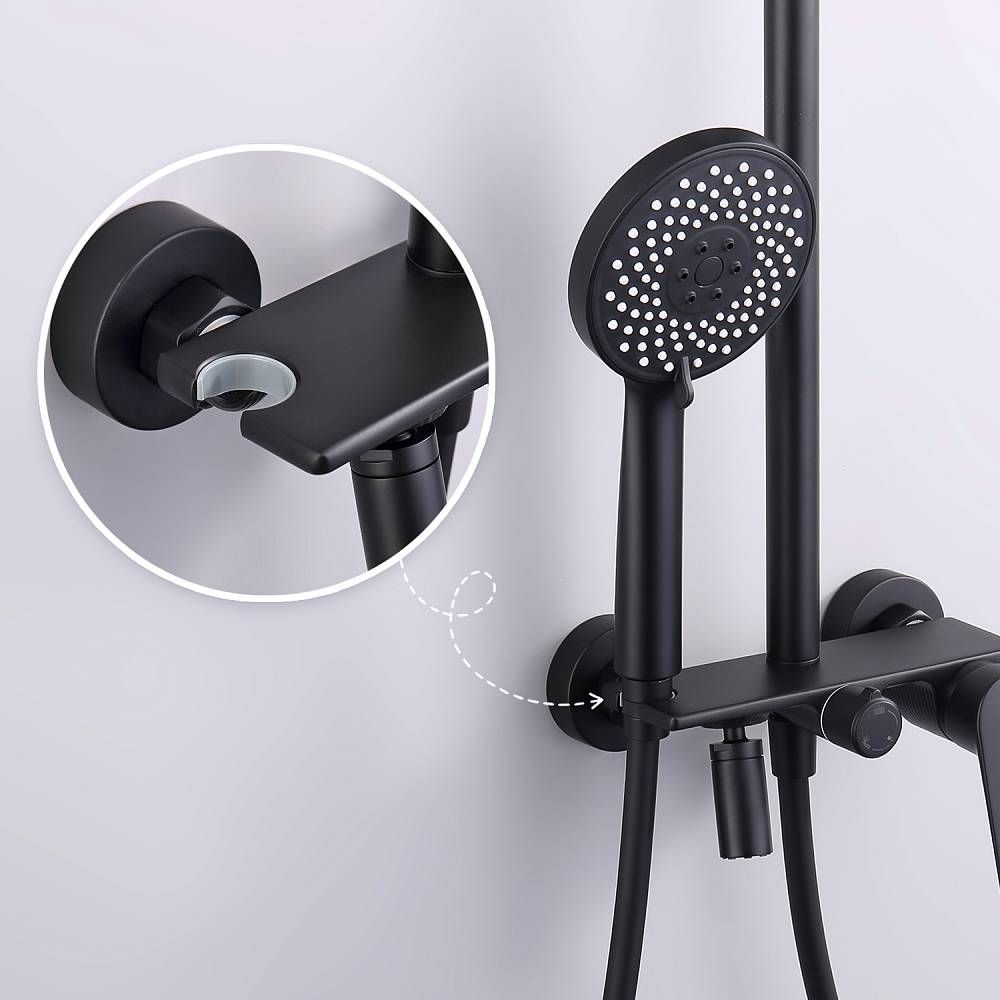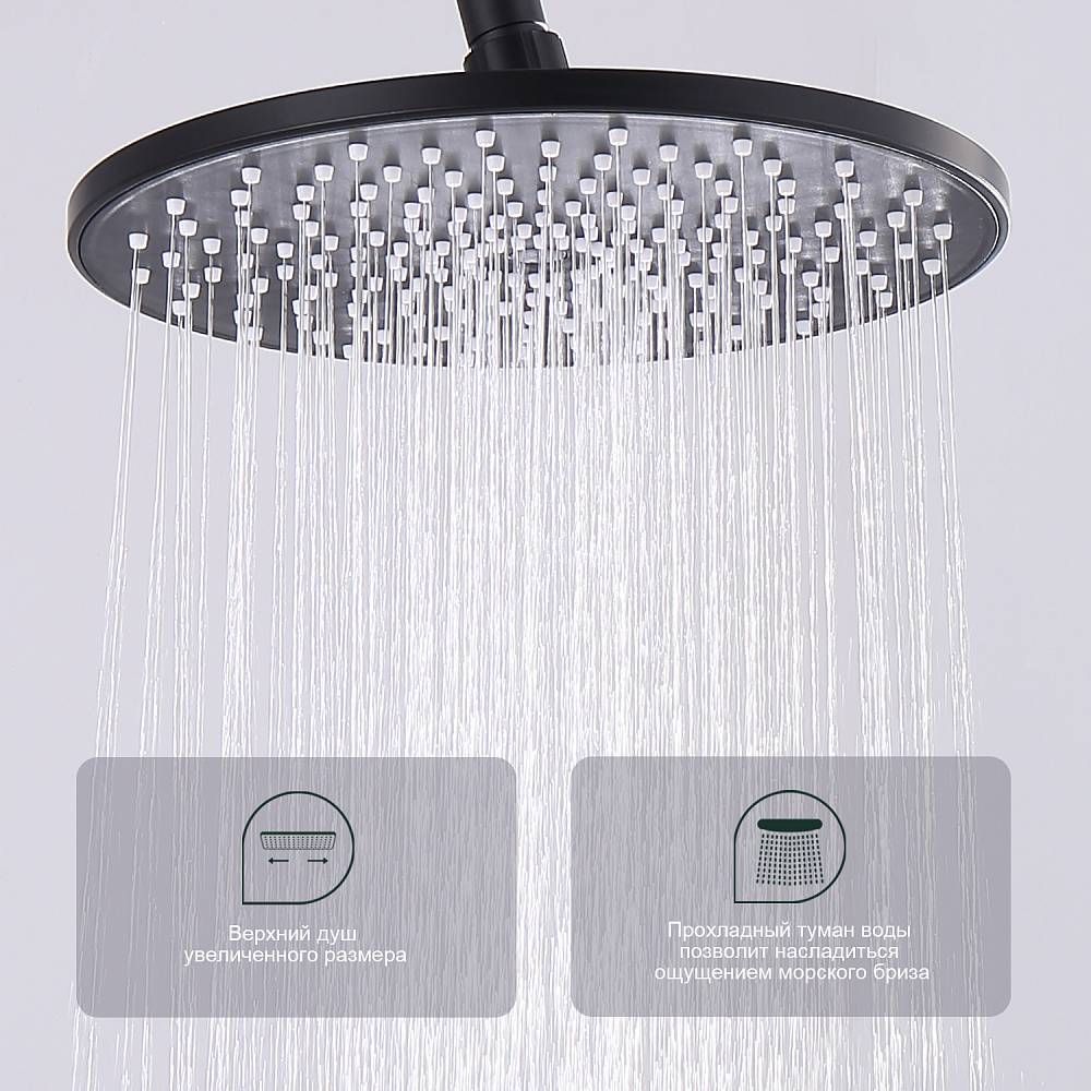 Душевая система Splenka S53.24.06, черный. Душевая система подходит для ванны и душа. Верхний душ имеет круглую форму размером 22 см. Ручная лейка у системы 3-х режимная. Лейки изготовлены из авс-пластика. Изделие выполнено в черном цвете, корпус латунный. Гарантия 5 лет.