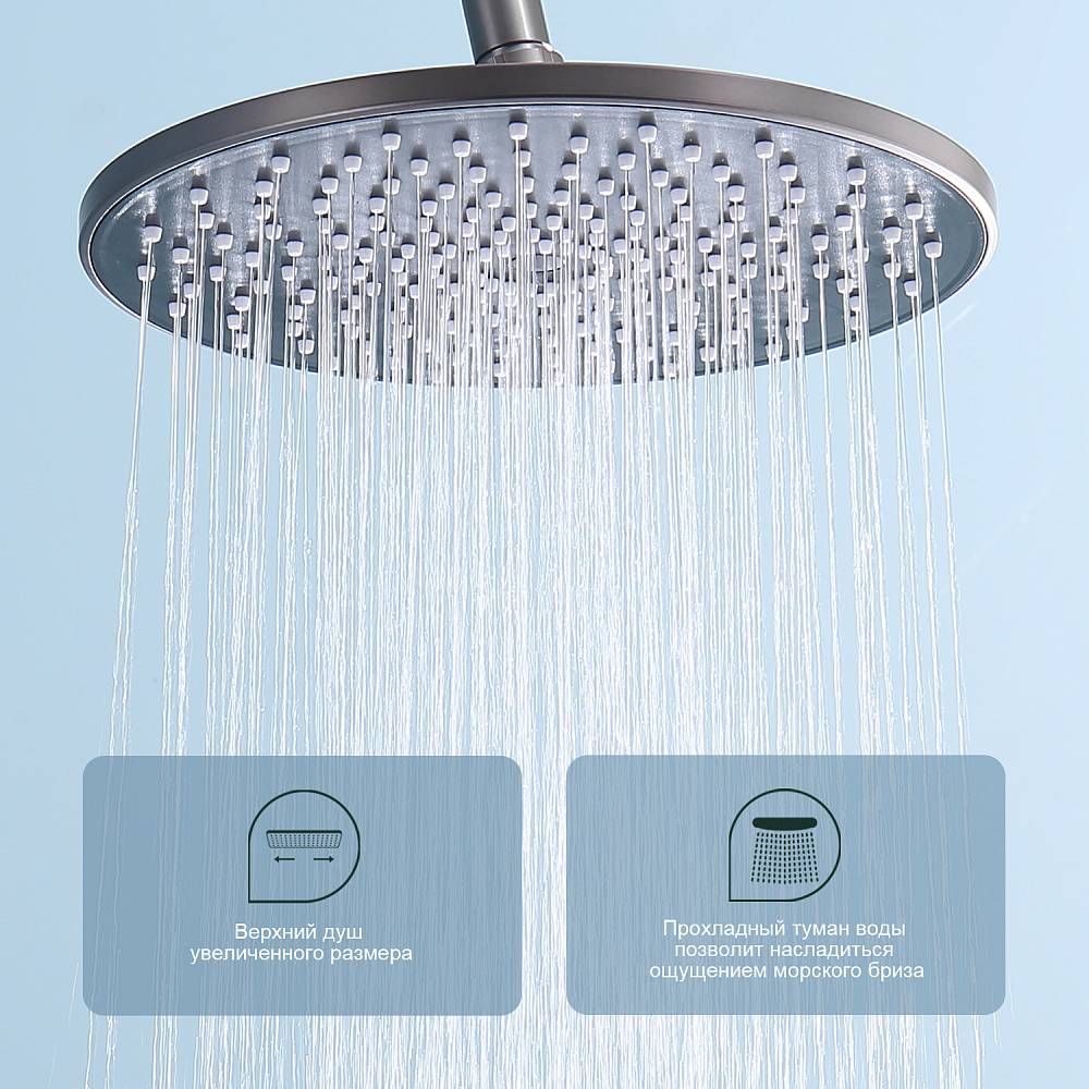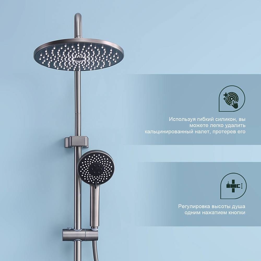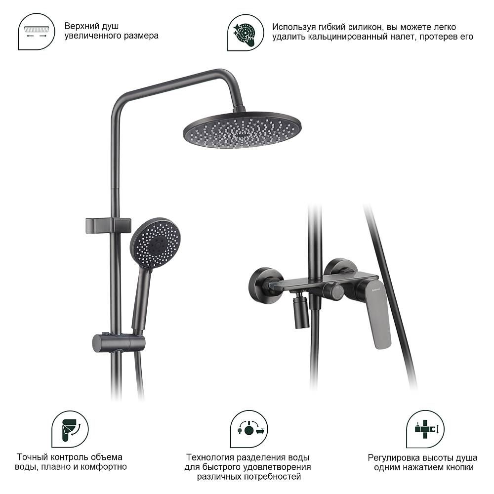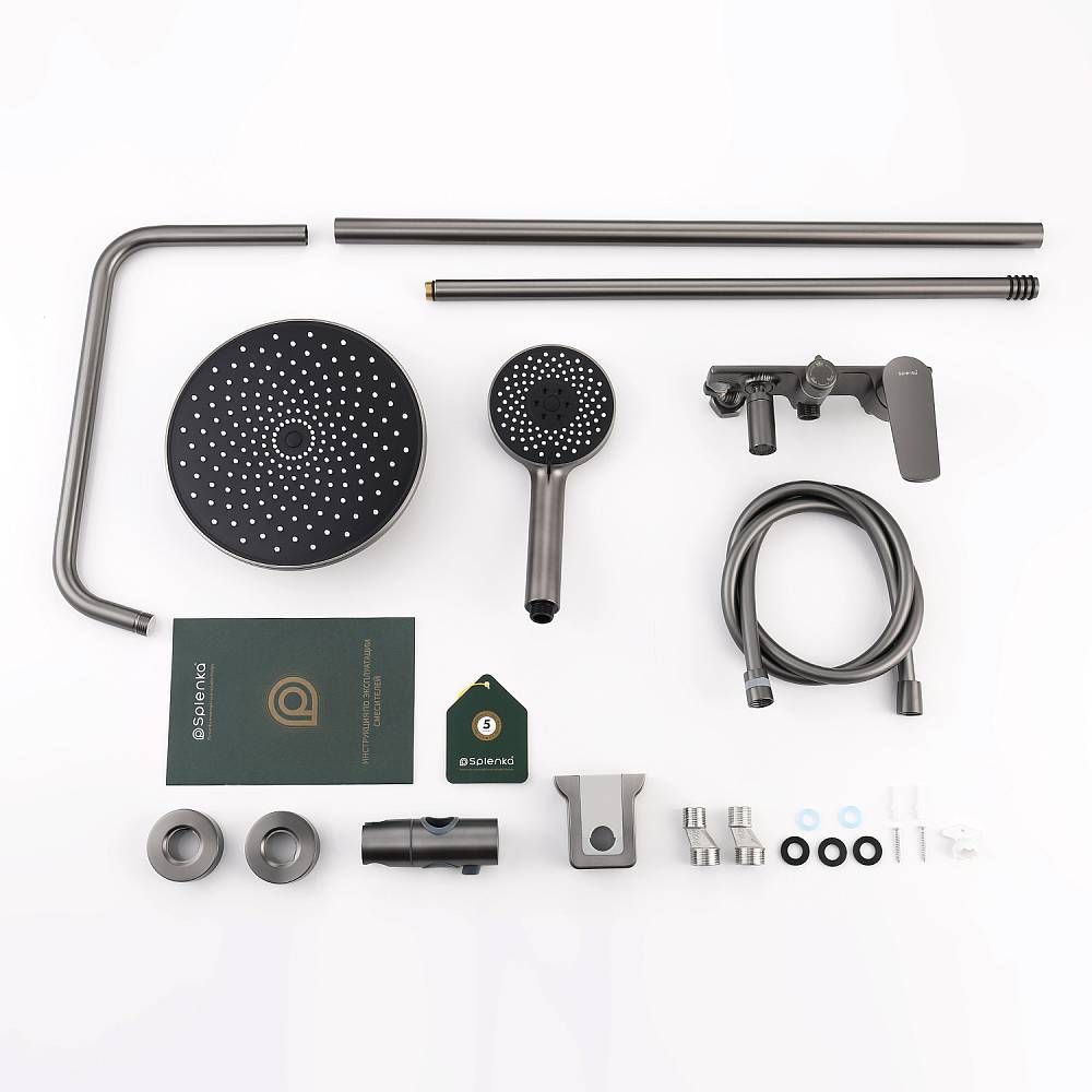 Душевая система Splenka S53.24.09, графит. Душевая система подходит для ванны и душа. Верхний душ имеет круглую форму размером 22 см. Ручная лейка у системы 3-х режимная. Лейки изготовлены из авс-пластика. Изделие выполнено в черном цвете, корпус латунный. Гарантия 5 лет.