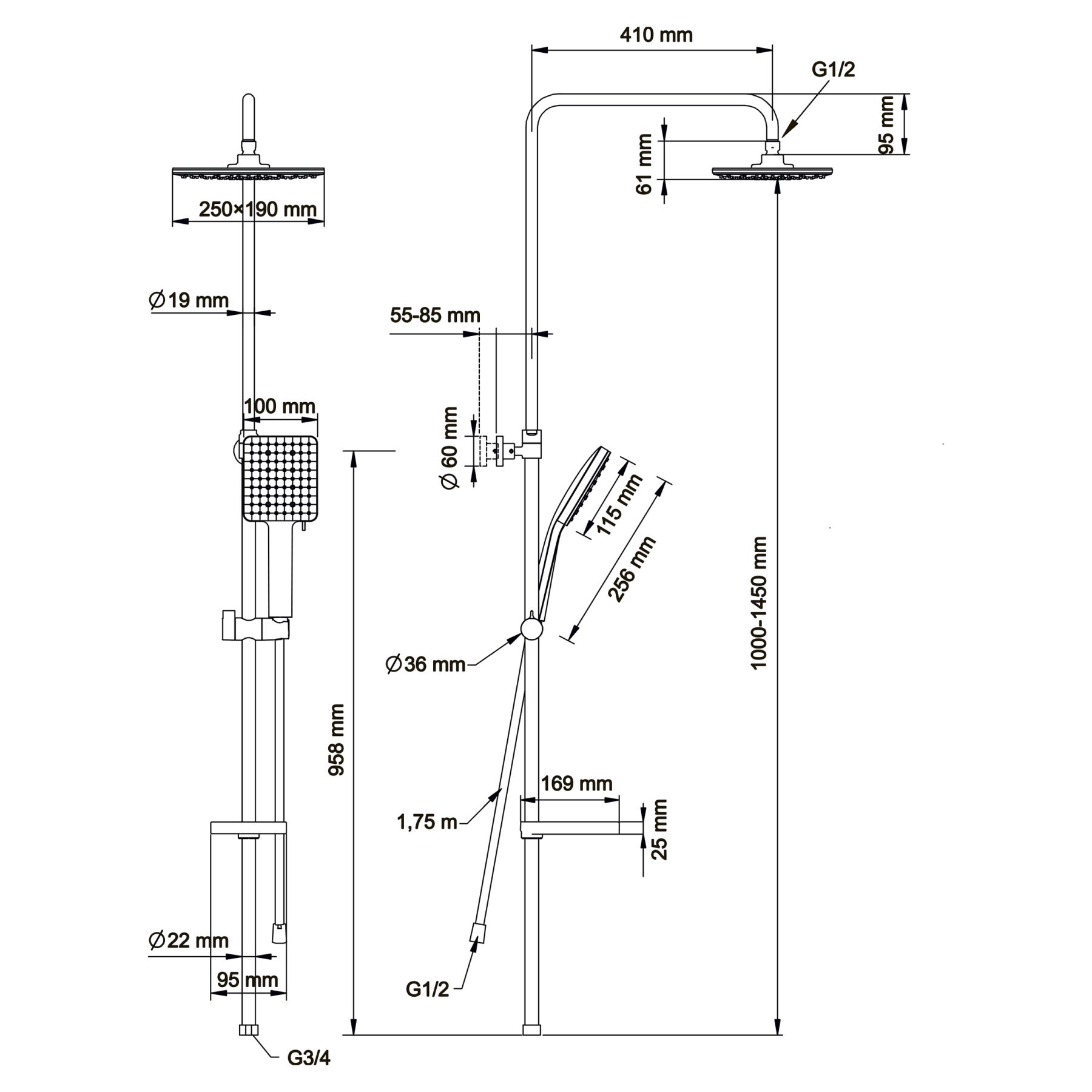 Семейный душ с верхним подключением и со смесителем для душа, верхний душ: 250х190 мм,лейка: 100х115 мм, 6 режимов.Шланг PVC: 1,75 м.Цвет: черный.