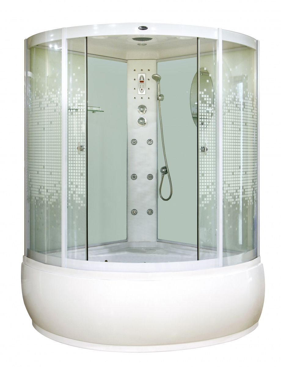 Поддон акриловый высокий 53см(сиденье на поддоне), глубина 33см, сифон с гофрой,экран съемный,профиль белый,центральная панель белая, задние стенки закаленные,белые, крашенные, передние стекла закаленные,прозрачные, рисунок мозаика, смеситель 3-х режимный,полочка,пульт, подсветка, верхний душ,ручной душ,зеркало,гидромассаж.