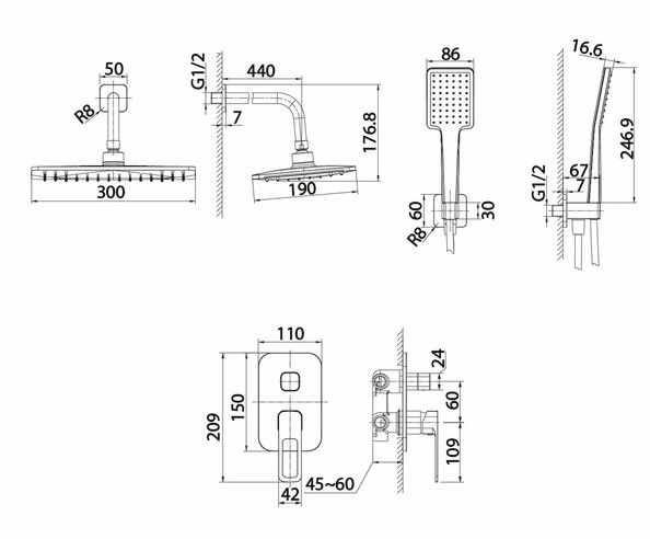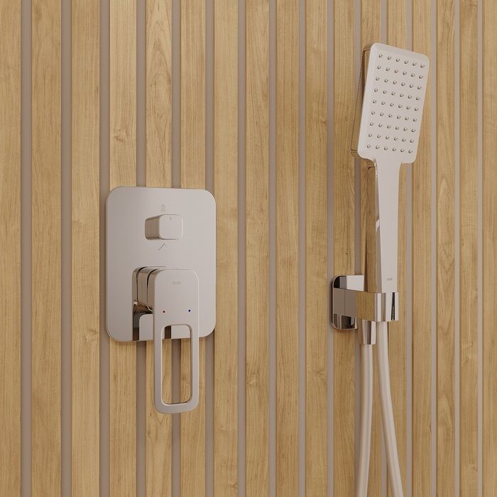 Готовый набор встраиваемой сантехники в хроме включает всё необходимое для обустройства комфортной красивой ванной. Так выгоднее и удобнее, чем купить всё по отдельности. Оптимальная подборка сантехники Slide: смеситель, верхняя лейка с кронштейном для тропического душа, ручная лейка, душевой шланг 1,5 м и выход для шланга с держателем для лейки.