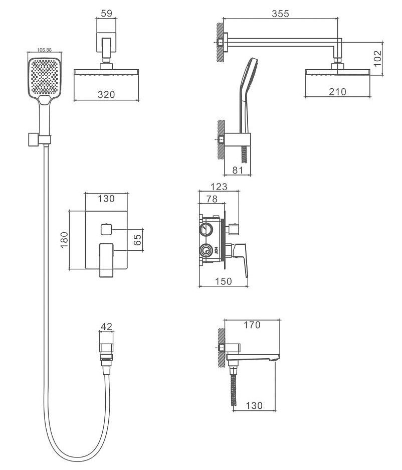 Форма верхнего душа: прямоугольная. Размер верхнего душа (ШхД): 320х210 мм. Количество режимов струи ручного душа: 3. Монтаж: встраиваемый. Излив - функция переключения.