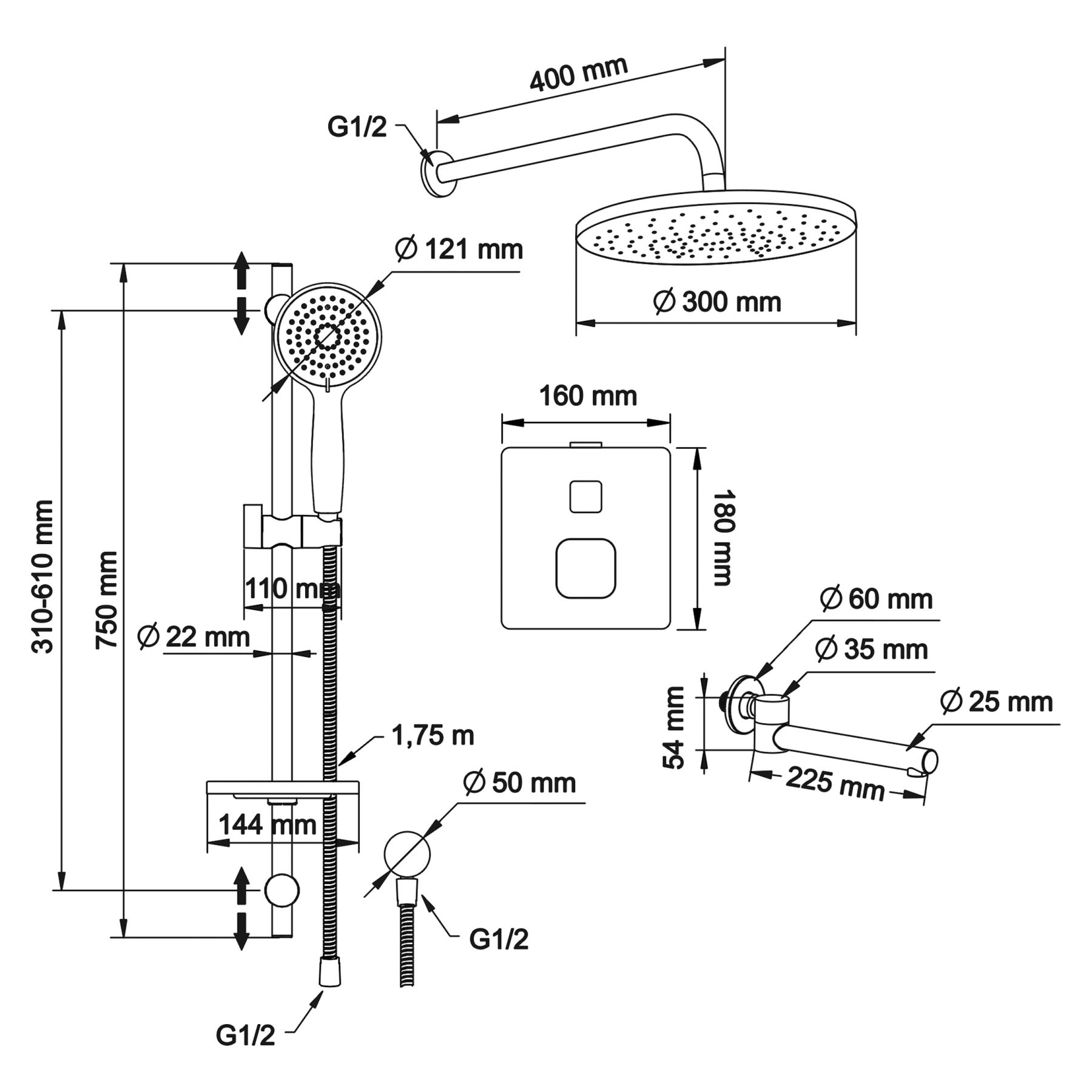 Душевой комплект со встраиваемым термостатическим смесителем на 3 выхода (в монтажном боксе), верхним душем ø300 мм, лейкой ø121 мм (3 режима) и поворотным изливом