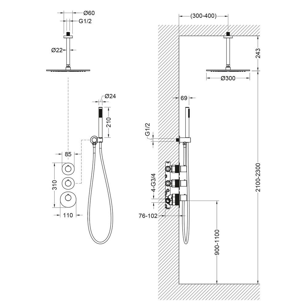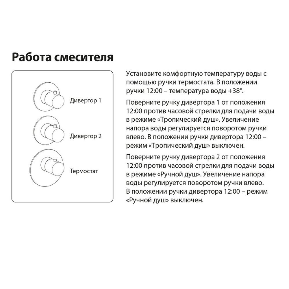 Душевая система с термостатом Saona 2399 относится к премиальному сегменту, предназначена для монтажа в полой или твердой стене. Верхний душ с вертикальным потолочным креплением выполнен из латуни. Термостатический картридж поддерживает стабильную температуру воды, обеспечивая максимально комфортные условия для принятия водных процедур. Регулируя напор воды в режиме "тропический душ" можно получить массажное воздействие различной интенсивности. Основные преимущества встроенной системы: элегантный внешний вид, все коммуникации и крепления спрятаны в стену, снаружи видны только декоративные элементы. Установить встроенную систему можно в любом месте. Регулировка температуры воды осуществляется ручкой термостата (расположена снизу). Включение режима "тропический душ" и регулировка напора осуществляется поворотом ручки дивертора (расположена сверху) влево. В положении ручки дивертора 12:00 режим "тропический душ" выключен. Для переключения в режим "ручной душ" поверните ручку дивертора (расположена по центру) от 12:00 против часовой стрелки. Увеличение напора воды регулируется поворотом ручки влево. В положении ручки 12:00 режим "ручной душ" выключен. Сложностей монтажа не возникает при установке элементов душевой системы опытным сантехником. Внимательно изучите инструкцию по монтажу и эксплуатации.