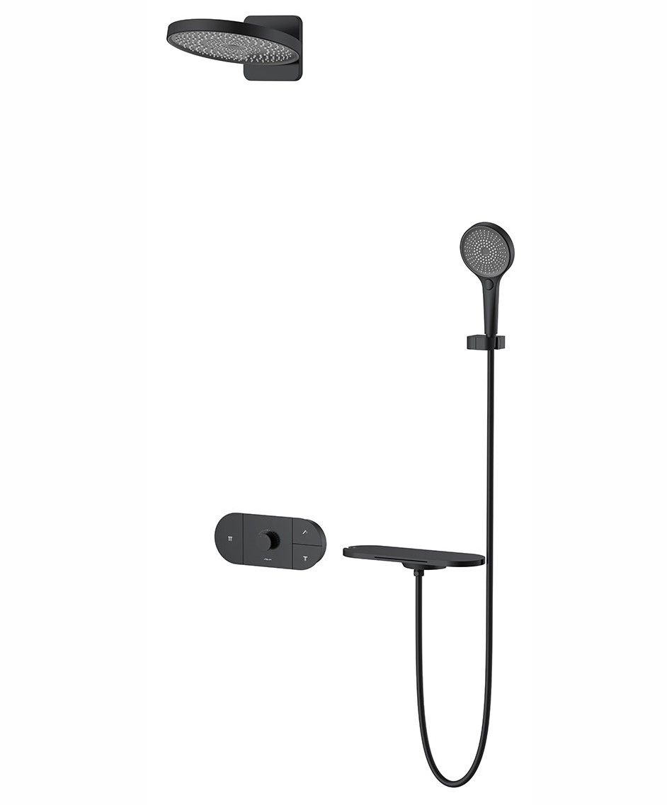 - Комплектация: верхний душ, полка с каскадным изливом и держателем ручного душа, ручной душ, смеситель со встраиваемой частью
