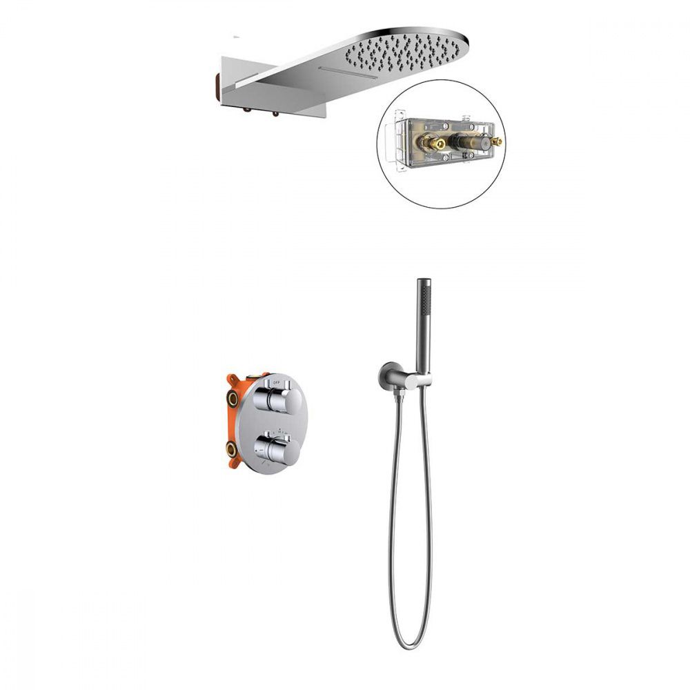 Состав комплекта: верхний душ, ручной душ, смеситель со встраиваемой частью