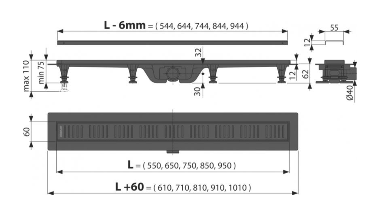 Душевой лоток AlcaPlast с порогами с перфорированной решетки 65см черный матовый APZ10BLACK-650M купить