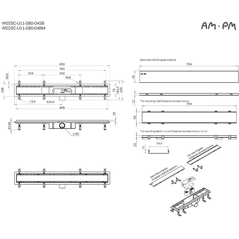 Душевой лоток AM.PM PrimeFlow 80 W02SC-U11-080-04SB с решеткой Хром матовый / под плитку Tile
