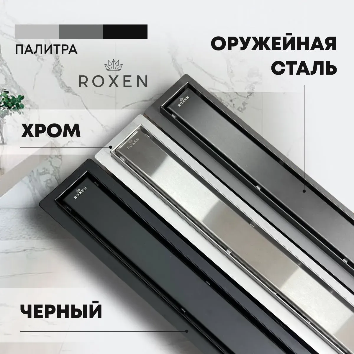 Душевой трап линейный (лоток) Roxen Supra Gun Metal двусторонний под плитку - это практичное, стильное, современное решение для организации душевой зоны. Душевой лоток выполнен в цвете "оружейная сталь", покрыт дополнительным устойчивым к химическим и механическим воздействиям покрытием, которое надежно защищает изделие от коррозии и царапин. Корпус и решетка трапа изготовлены из нержавеющей стали, сифон - пластиковый, обладает высоким уровнем прочности. Оборачиваемая декоративная решетка позволяет легко изменить дизайн душевой зоны. Одна сторона решетки предназначена под укладку плитки и делает сливное устройство практически незаметным, а вторая - из нержавеющей стали с покрытием с повышенной устойчивостью к коррозии и царапинам.