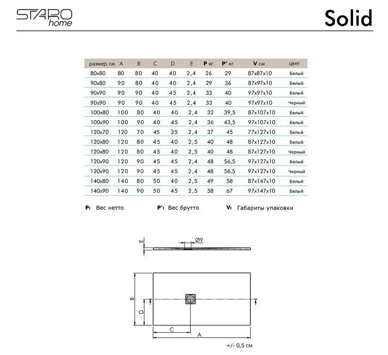 Душевой поддон Starohome Solid 90х90 WHITE MATT, 90 x 90 см, литьевой мрамор, квадратный, цвет белый матовыйДушевой поддон Solid изготовлен из литиевого мрамора Sanydur® и представляет собой монолитный материал на 85% состоящий из мраморной крошки, минеральных пигментов и связывающего материала в виде полиэфирной смолы. Сверху материал покрывается гелевым слоем Gel Coat Покрытие Gel Coat - это прочный прозрачный, абсолютно непористый материал, защищающий материал поддона от загрязнений, перепада температур и УФ-излучения. Душевые поддоны Solid производятся на современном европейском оборудовании для европейского рынка. Контроль качества осуществляется на всех этапах производства.