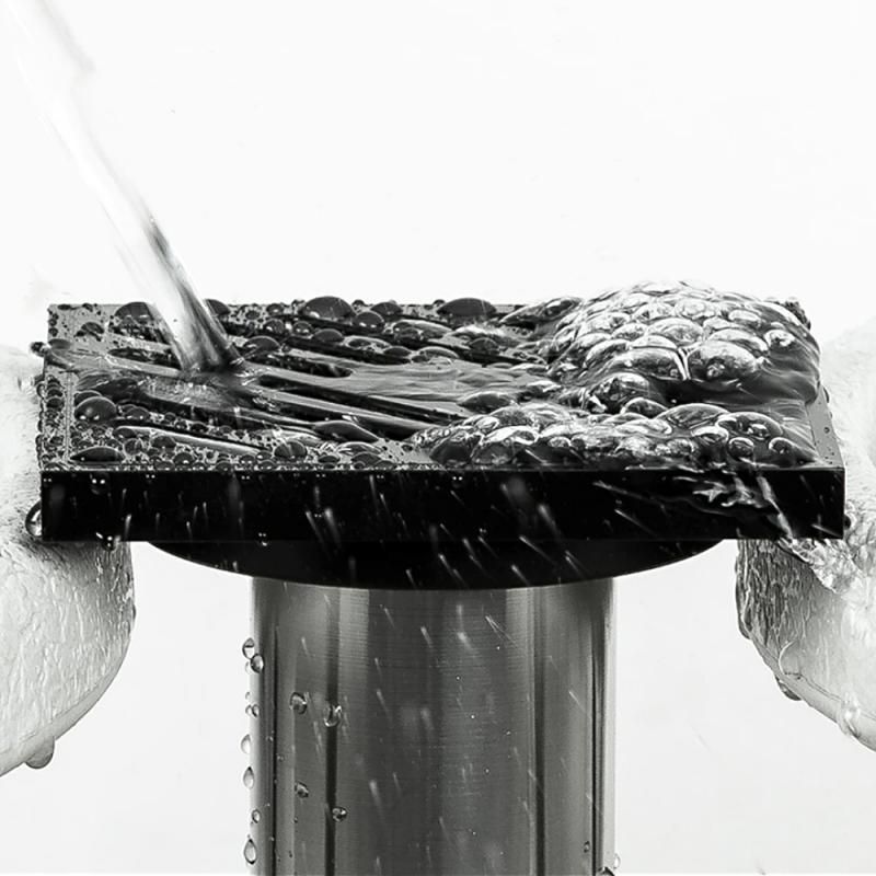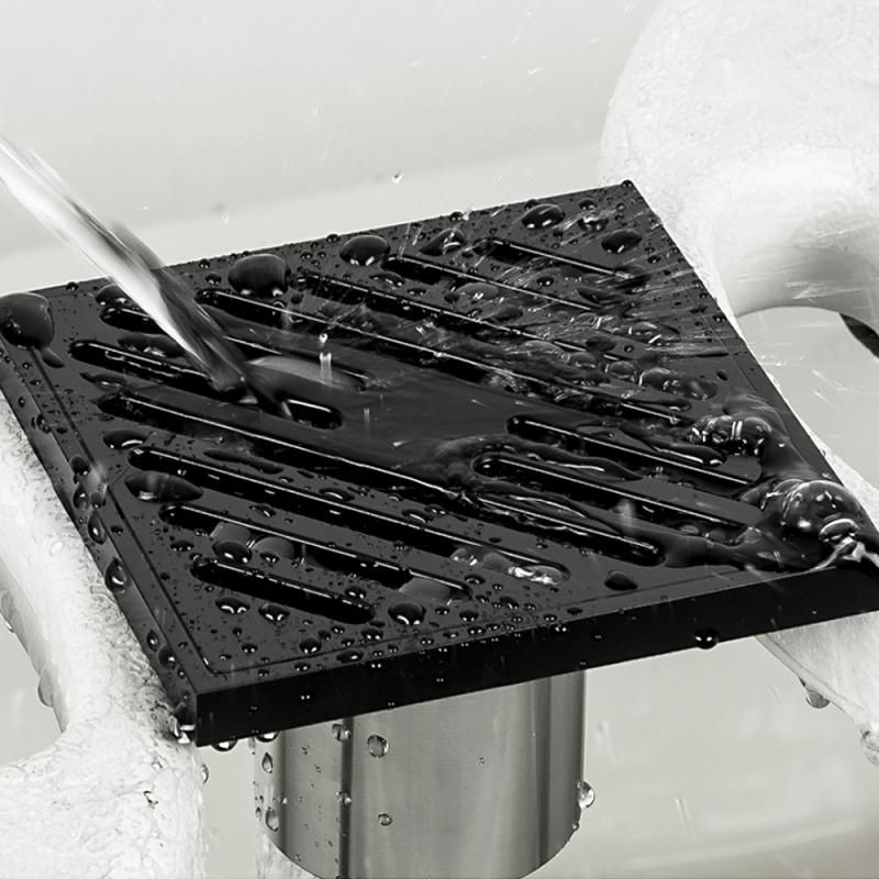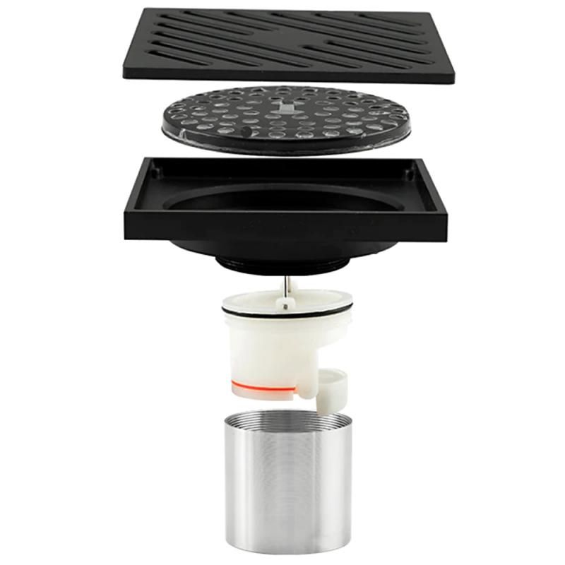 Квадратный душевой трап с вертикальным выпуском Gappo G81050-6, размер 10 * 10 см, цвет черный, изготовлен трап из нержавеющей стали.