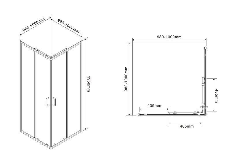 Квадратный душевой уголок, с двумя раздвижными дверьми,