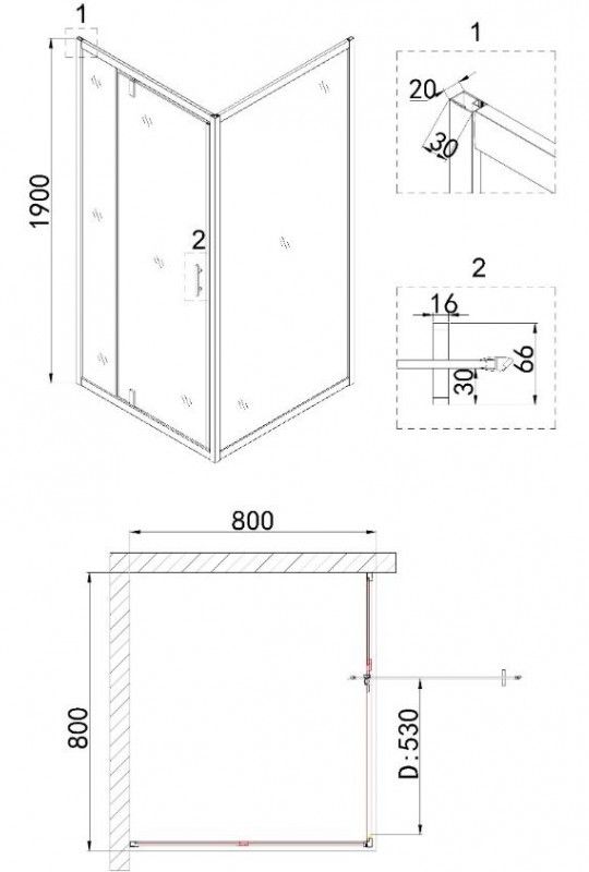 - квадратный душевой уголок 80x80 см (дверь в нишу + боковая стенка)