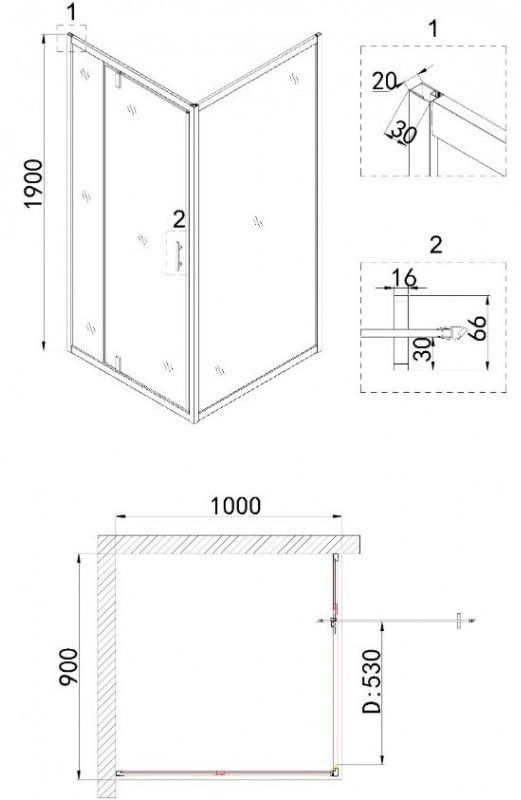 - прямоугольный душевой уголок 90x100 см (дверь в нишу + боковая стенка)