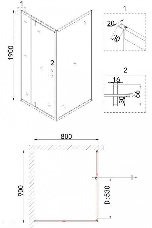 - прямоугольный душевой уголок 90x80 см (дверь в нишу + боковая стенка)