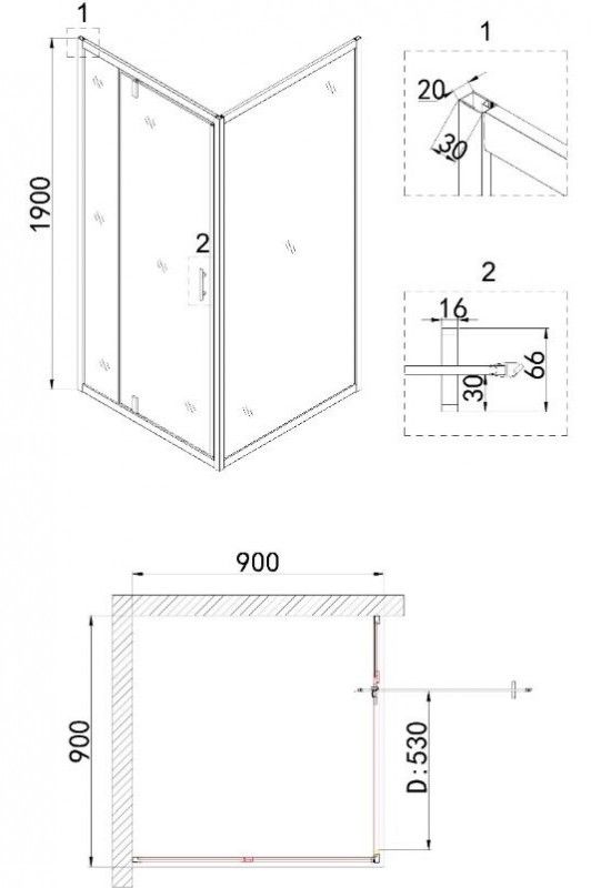 - квадратный душевой уголок 90x90 см (дверь в нишу + боковая стенка)