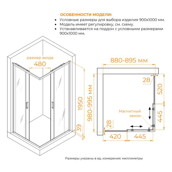 Размеры с диапазоном регулировок: (880-895)х(980-995) мм