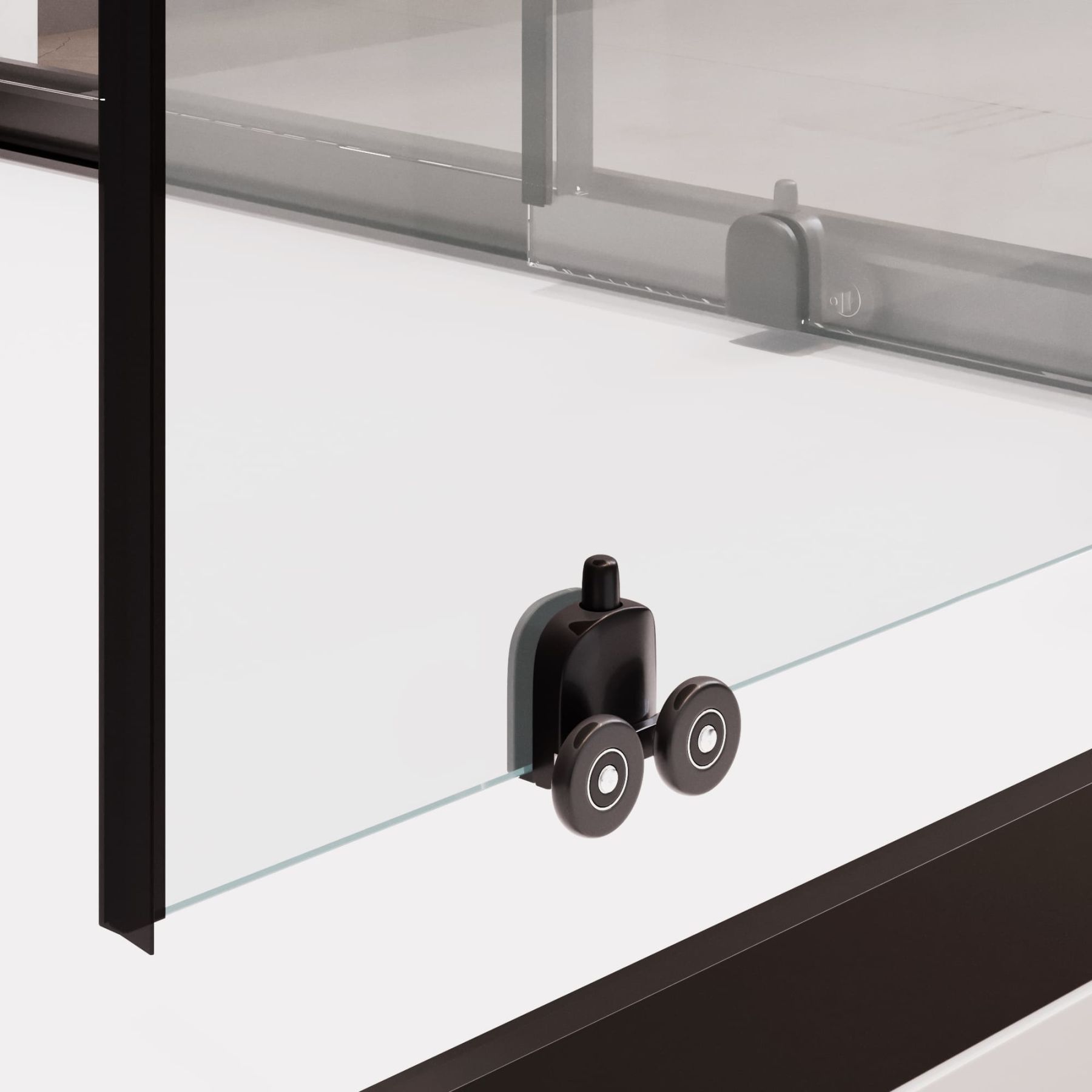 - Прочность и стиль: Закаленное стекло 6 мм устойчиво к нагрузкам, а строгий черный профиль задает современный акцент.