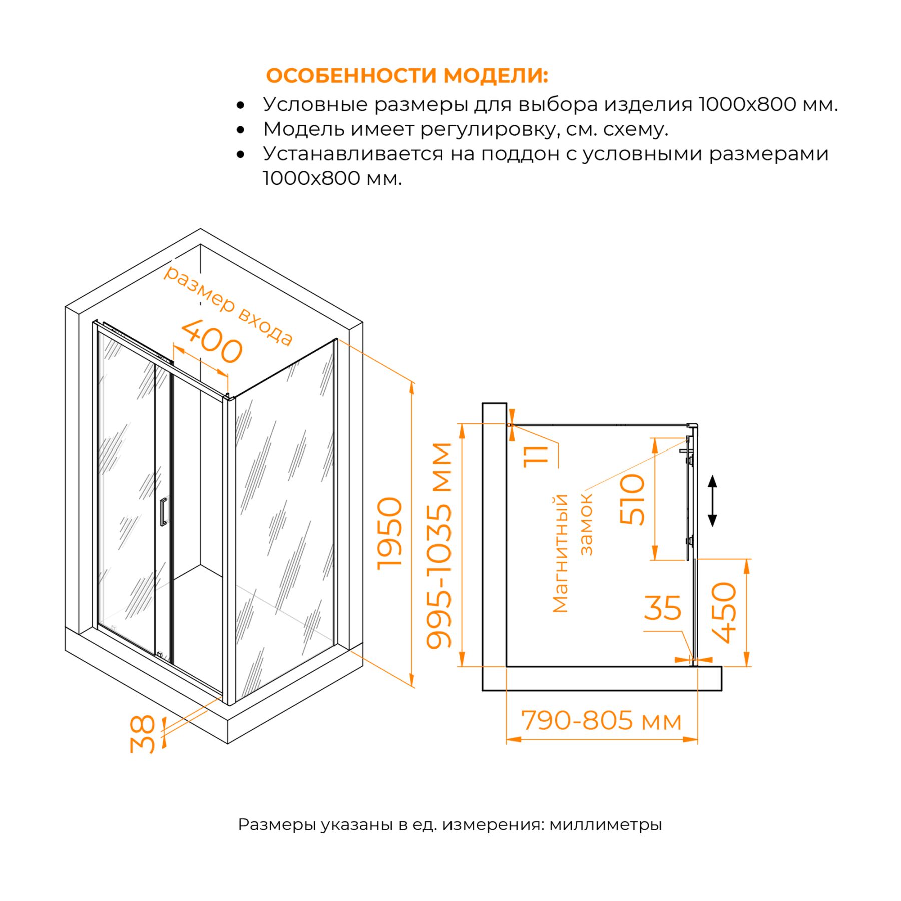 Размеры с диапазоном регулировок: (995-1035)x(790-805) мм