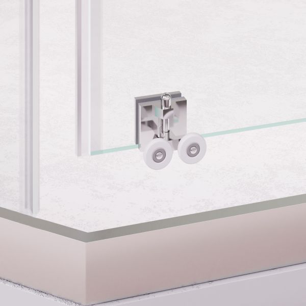 Двойные ролики скользят по верхнему и нижнему П-образному профилю. Нижний роликовый механизм оснащён системой «took off clean» — ролики можно отстегнуть для чистки стекла и профиля. При генеральной уборке дверное полотно полностью снимается. Фиксатор мягко амортизирует при открытии, обеспечивая бесшумное движение. Ресурс роликов — более 30 000 циклов (около 15 лет эксплуатации).