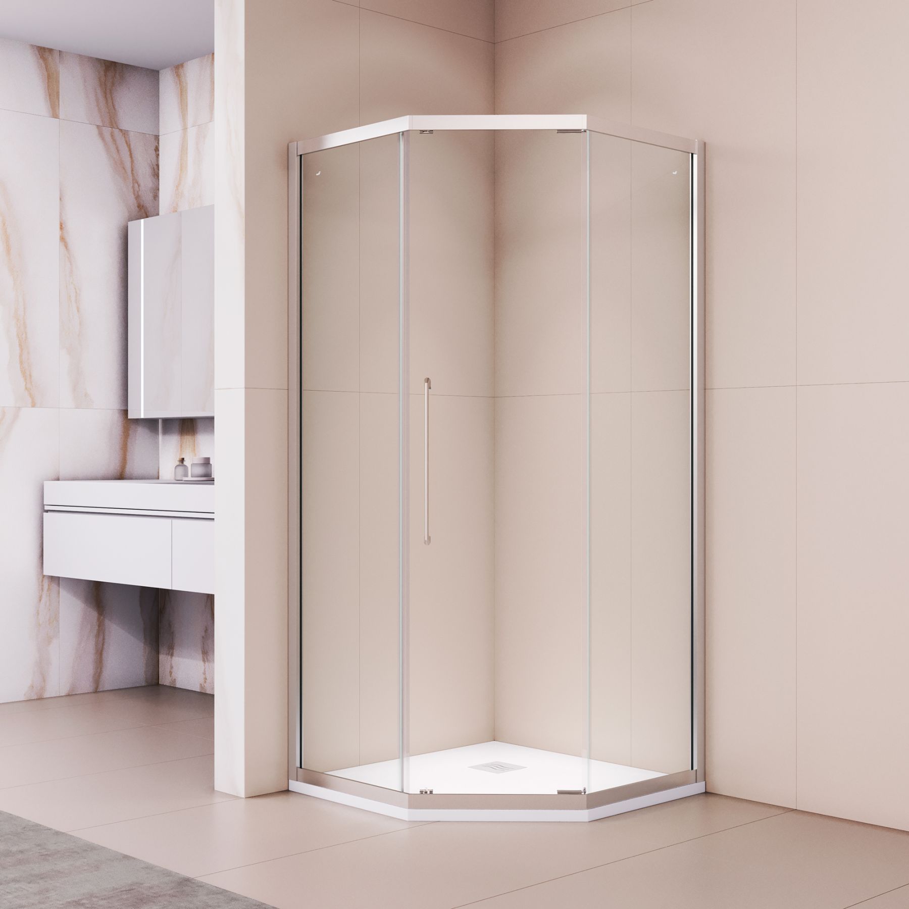 Трапециевидная форма позволяет установить изделие даже в минимальном пространстве, при этом внутренний объём остаётся просторным. По бокам легко разместить тумбу или стиральную машину. Конструкция включает три стеклянных полотна: два стационарных и одно подвижное. Дверное полотно при нажатии на ручку плавно сдвигается вдоль стационарной панели, не занимая дополнительного места — это идеальное решение для малогабаритных ванных комнат.
