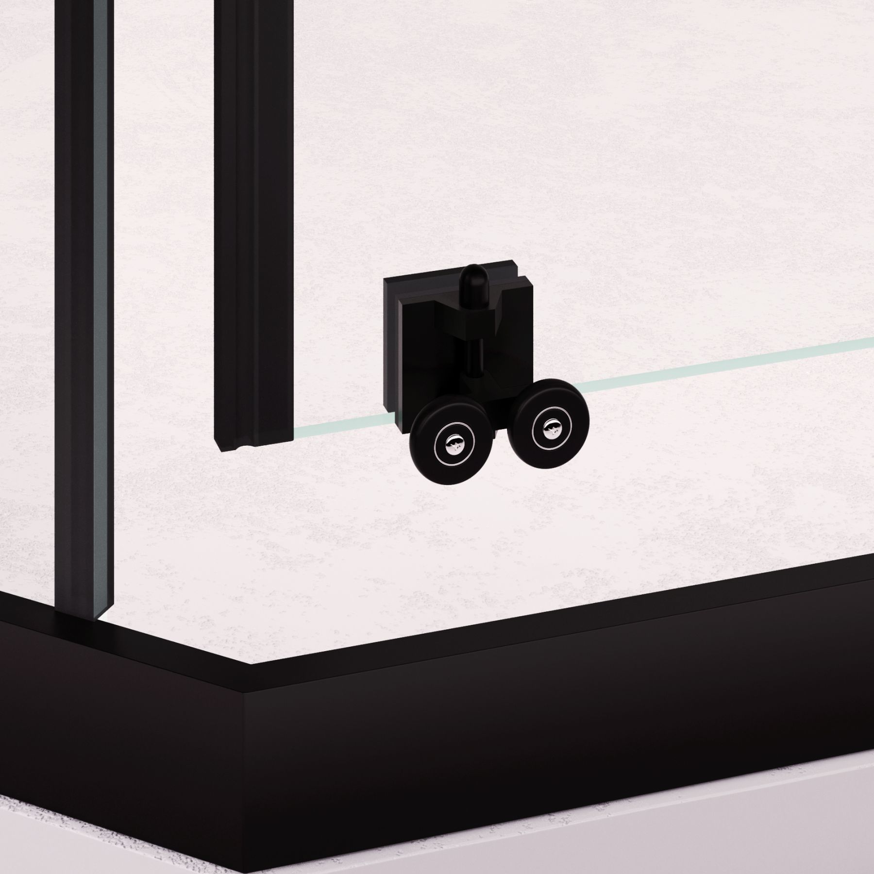 Двойные ролики скользят по верхнему и нижнему П-образному профилю. Нижний роликовый механизм оснащён системой «took off clean» — ролики можно отстегнуть для чистки стекла и профиля. При генеральной уборке дверное полотно полностью снимается. Фиксатор мягко амортизирует при открытии, обеспечивая бесшумное движение. Ресурс роликов — более 30 000 циклов (около 15 лет эксплуатации).
