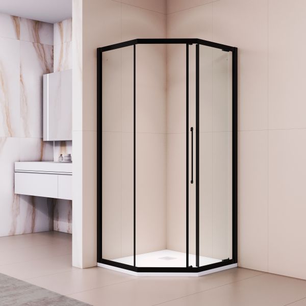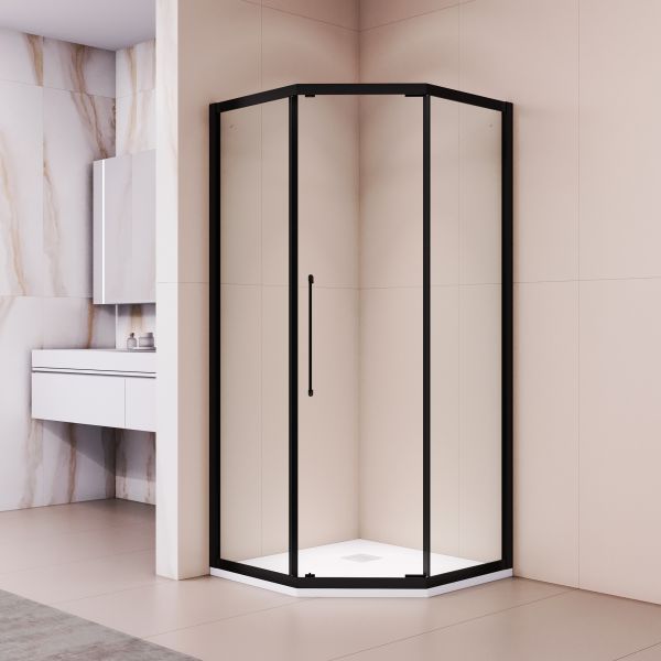 Трапециевидная форма позволяет установить изделие даже в минимальном пространстве, при этом внутренний объём остаётся просторным. По бокам легко разместить тумбу или стиральную машину. Конструкция включает три стеклянных полотна: два стационарных и одно подвижное. Дверное полотно при нажатии на ручку плавно сдвигается вдоль стационарной панели, не занимая дополнительного места — это идеальное решение для малогабаритных ванных комнат.