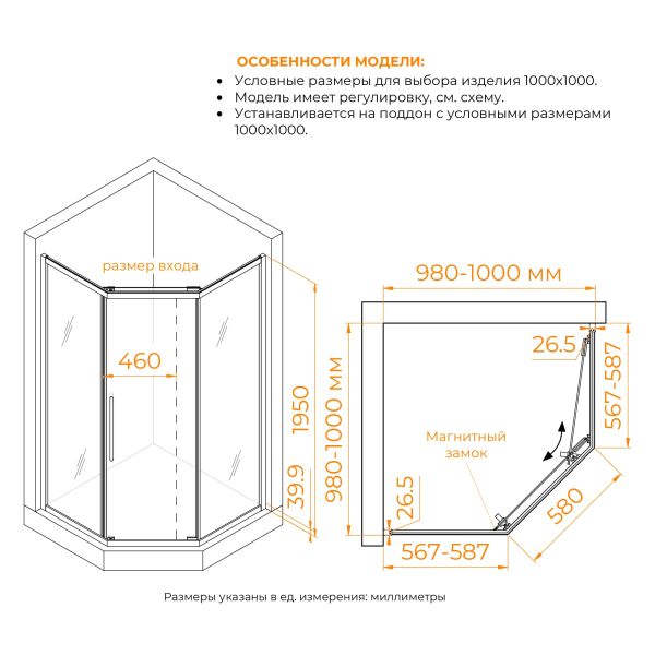 Ограждение для душа выполнено из закалённого стекла и усилено рамой из анодированного алюминия. Уникальность модели заключается в раздвижной (откатной) двери, которая формирует герметичное пространство душевой зоны, сохраняя максимум свободного места. Благодаря срезанному углу от квадратной формы душевой уголок особенно удобен для компактных ванных комнат или массажных кабинетов.