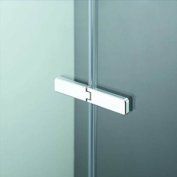 Душевой уголок состоит из трех полотен стекла - два стационарных полотна и одно полотно «Дверь», которая распахивается на широкий вход, благодаря двум элегантным прямоугольным петлям, типа «стекло-стекло».