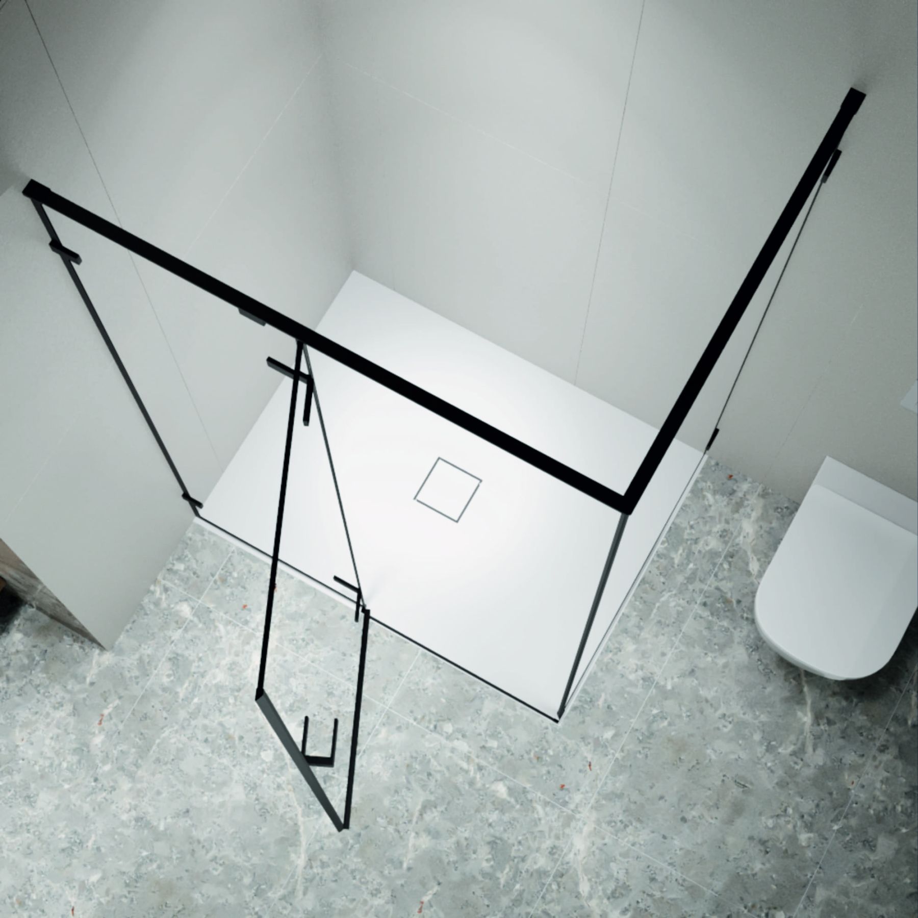 Душевой уголок состоит из трех полотен стекла - два стационарных полотна и одно полотно «Дверь», которая распахивается на широкий вход, благодаря двум элегантным прямоугольным петлям, типа «стекло-стекло».