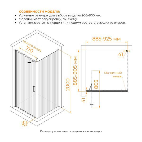 Душевой угол квадратный с распашной дверью имеет универсальный монтаж, он устанавливается на душевой поддон или подиум выложенного керамической плиткой.