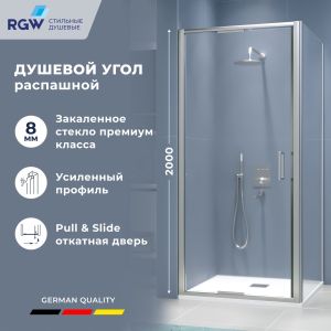 Модель состоит из уникальной душевой двери поворотно-распашного типа (ротор - Pull&Slide) RGW SV-05-2 и универсальной боковой стеклянной панели, в быту называют «Боковиной» RGW Z-06.